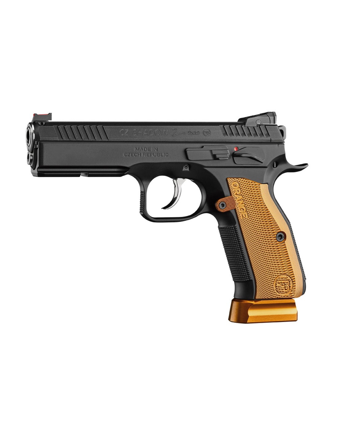 PISTOLA CZ SHADOW 2 ORANGE Un arma perfecta que lleva tu experiencia de tiro y resultados a la cima absoluta. La excelente base de diseño de este modelo ha sido mejorado con ajustes precisos realizados por armeros especializados y la utilización de piezas de alta calidad. La palabra “ORANGE” en el nombre de estas pistolas deportivas CZ representa la más alta calidad posible y absoluto alto rendimiento. Lo mismo es, por supuesto, para este modelo también. Se ha basado en la CZ SHADOW 2, pistola que actualmente ocupa el podio en la División de Producción en los más prestigiosos eventos internacionales de IPSC. El modelo “ORANGE”, que se distingue a primera vista por el nuevo diseño de sus cachas de aluminio en el típico color naranja, ha sido llevado a la perfección gracias a los diferentes ensayos y modifcaciones realizadas. Las piezas principales están ajustadas y ensambladas a mano, el mecanismo de gatillo está confgurado para un desplazamiento muy suave y tiene un reinicio acortado. El cañón está pulido y para mejorar la alta precisión, también incorpora un casquillo en el cañón. Además, la pistola está equipada con un martillo IPSC y una retenida del cargador ajustable en aluminio. El cargador tiene una base de aluminio y el cierre de seguridad izquierdo sobredimensionado proporciona mejor agarre. Disponible en cl.9x19 Largo cañón: 119 mm. Largo total: 217 mm. Peso: 1,330 Kgs.