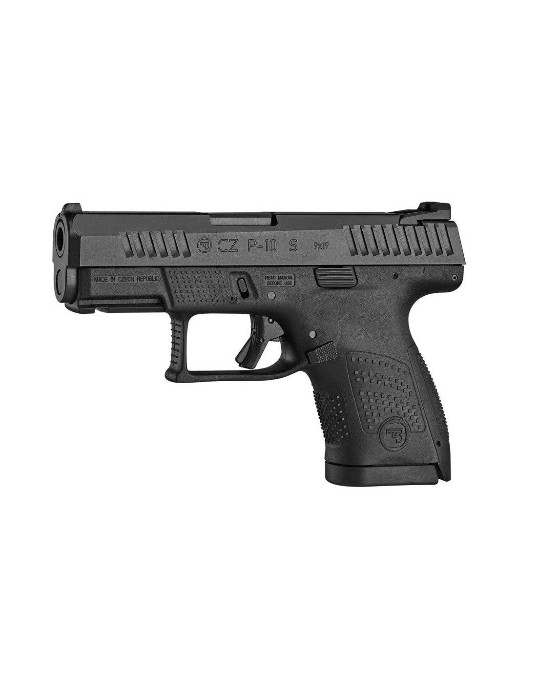 PISTOLA CZ P-10 S CZ P-10 S es otra variante de la exitosa línea de pistolas con percutor lanzado P-10. Por su tamaño subcompacto que permite su porte oculto, la pistola es apropiada ante todo para la defensa personal o como un arma de reserva para miembros de las fuerzas armadas. Conserva el confort de tirador y la facilidad de uso de la versión básica Full Size. La pistola posee una capacidad de cargador de 12 cartuchos,superior a las de su categoría. Disponible en cl.9x19 Largo cañón: 90 mm. Largo total: 170 mm. Peso: 800 grs.
