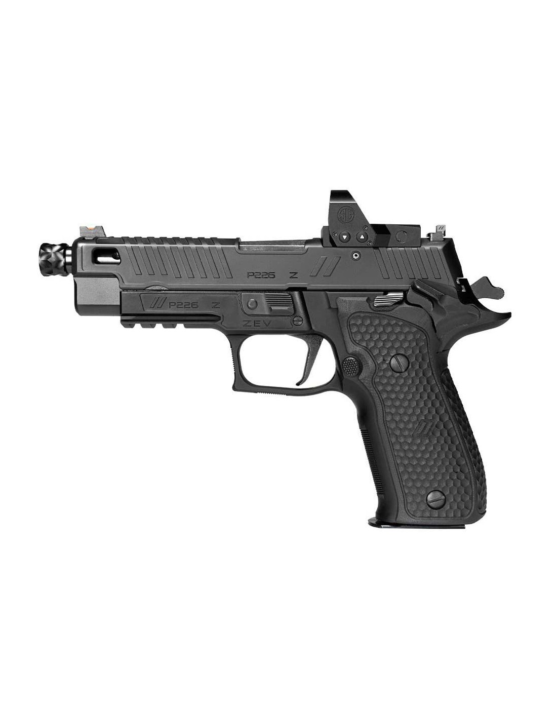 Su ergonomía y equilibrio excepcionales hacen que esta pistola Full-Size sea fácil de manejar y un placer para disparar. Con una cámara de 9 mm, la P226 ZEV es una pistola personalizada de acción única (SAO) desarrollada con ZEV Technologies para crear una versión verdaderamente única de la venerable P226.