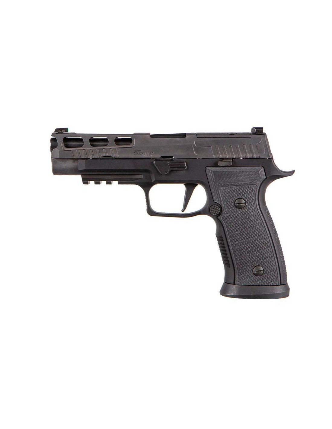 La pistola Sig Sauer P320 AXG PRO es la primera pistola de tamaño completo de la familia de pistolas P320 totalmente metálicas AXG. El aspecto característico de la corredera Pro-Cut Nitron combina a la perfección con el módulo AXG Grip de metal anodizado negro. Las características modernas y la modularidad de la plataforma P320, combinadas con el rendimiento y la sensación de un marco de metal, ofrecen una experiencia de disparo verdaderamente especial.