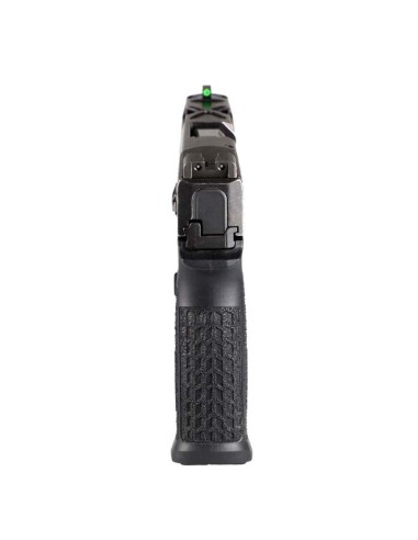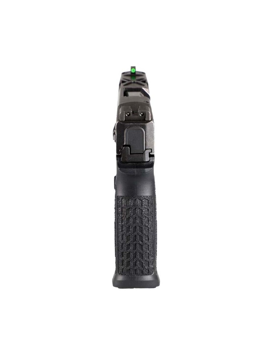 El módulo de agarre de la pistola P320 XCompact Spectre está grabado con láser con un patrón personalizado en los cuatro lados que brinda una textura agresiva pero elegante, para un agarre más fuerte y controlado. La corredera está diseñada con el exclusivo grabado Spectre X-Pattern, cortes relámpago y estrías graduadas con una corredera desgastada / cañón negro o corredera Nitron / cañón de oro TiN (consultar).