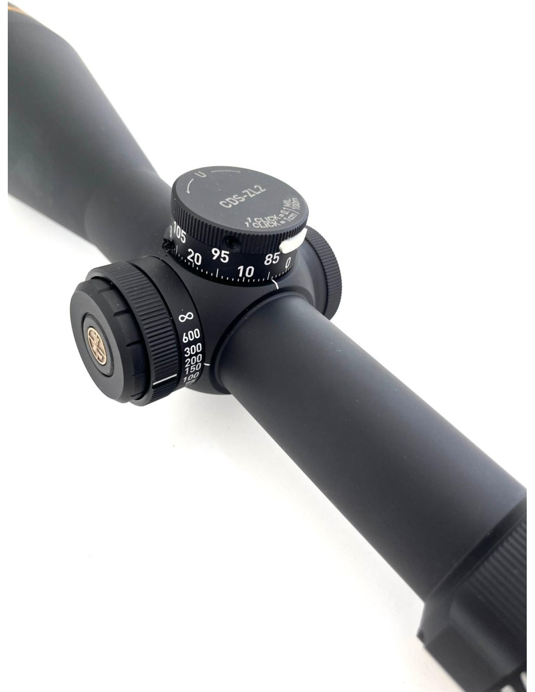 - Torreta de bajo perfil, con un máximo de dos rotaciones completas, permitiendo una elevación máxima de 38 MOAs. El botón de bloqueo permanece a la vista durante la primera vuelta y se esconde durante la segunda. El sistema CDS-ZL2 (Custom Dial System ZeroLock2) para la torreta de altura, se maneja fácilmente para establecer posiciones de forma rápida, basta con presionar el botón de bloqueo a la vez que realizamos el giro. Además, el sistema permite una fácil puesta a cero y por tanto la vuelta a la posición de partida de forma muy rápida.