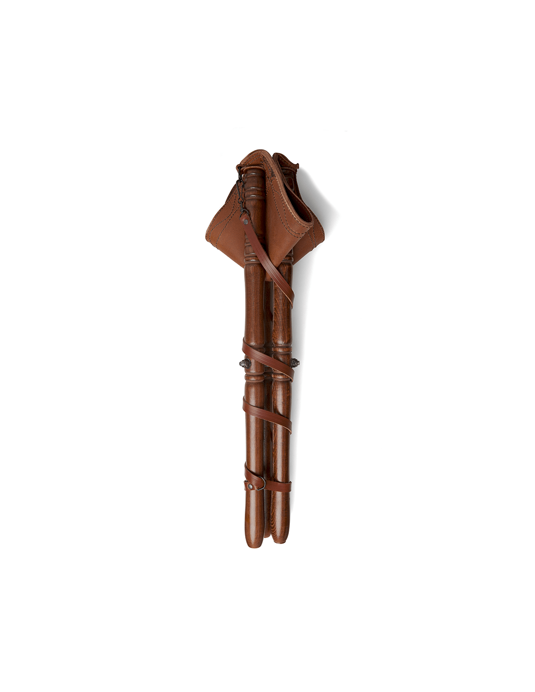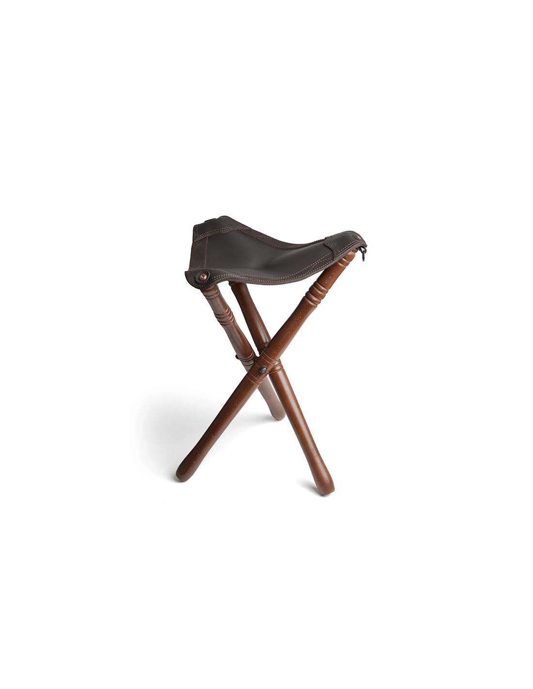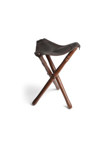 Este trípode de madera de haya es resistente, estable y cómodo. El asiento es de cuero engrasado en color burdeos.