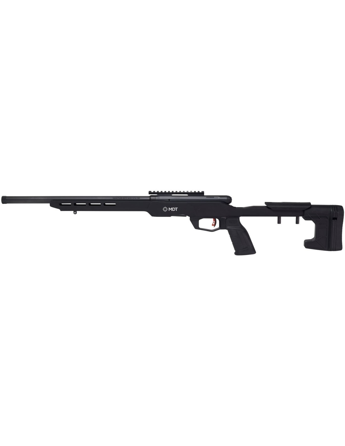 El elemento más llamativo de esta carabina Savage B22 Precisión Lite es el chasis de aluminio sobre el que va montado. Este es fruto de la colaboración con un tercero, concretamente con la prestigiosa casa canadiense Modular Driven Technologies (MDT). Su principal ventaja es el aporte de rigidez al conjunto, lo que obviamente se traduce en una mejora de la precisión. Todo ello sin que el peso del conjunto exceda demasiado, ya que solo pesa 3,3 Kg, una buena cifra para un rifle de precisión que monta un cañón pesado.