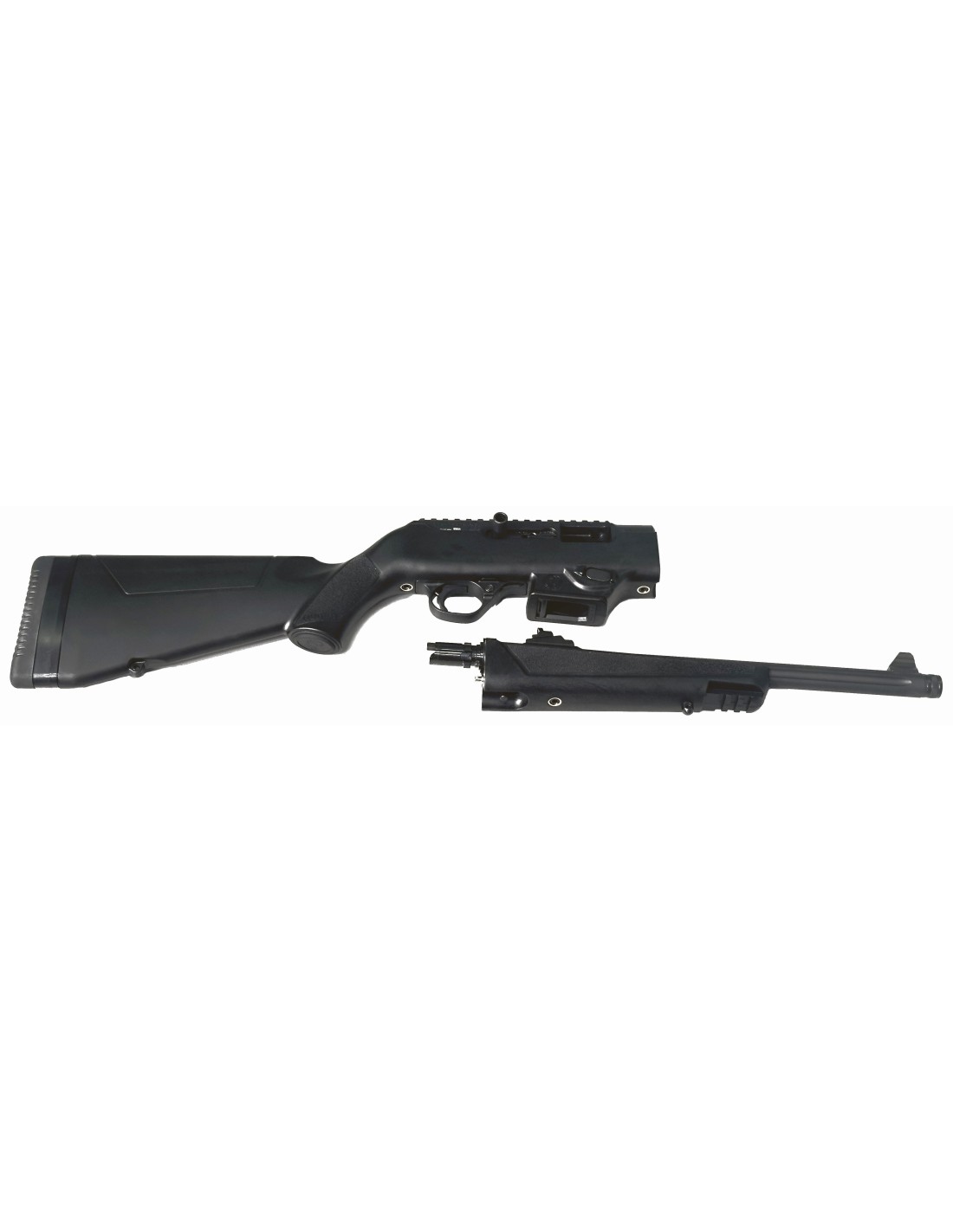Similar a la popular Ruger 10/22 Takedown, la PC Carbine está diseñada para una rápida separación del conjunto de cañón/guardamanos de la acción para facilitar el transporte y el almacenamiento. El desmontaje es tan sencillo como bloquear el cerrojo y comprobar que el rifle está descargado, empujar una palanca empotrada, girar los subconjuntos y separarlos.