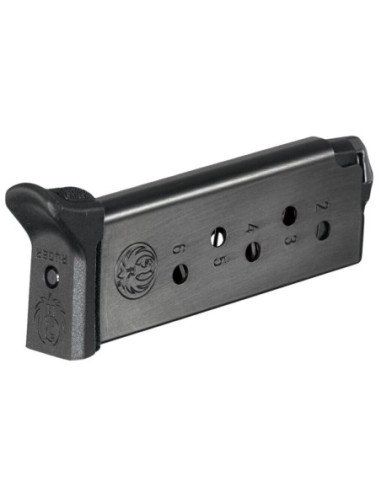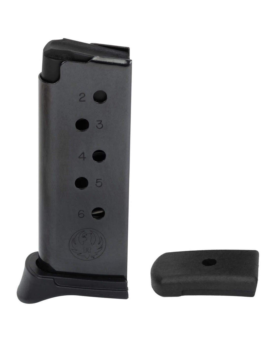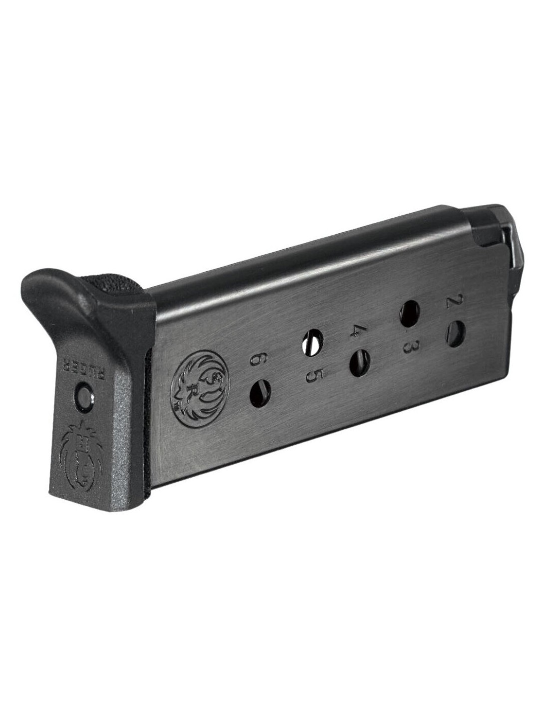 Cargador del calibre 380 Auto / 9 corto de acero pavonado con capacidad para 6 balas y placa de base extendida (incluye placa plana estándar). Valido par pistolas Ruger LCP. Accesorio de fábrica original Ruger.