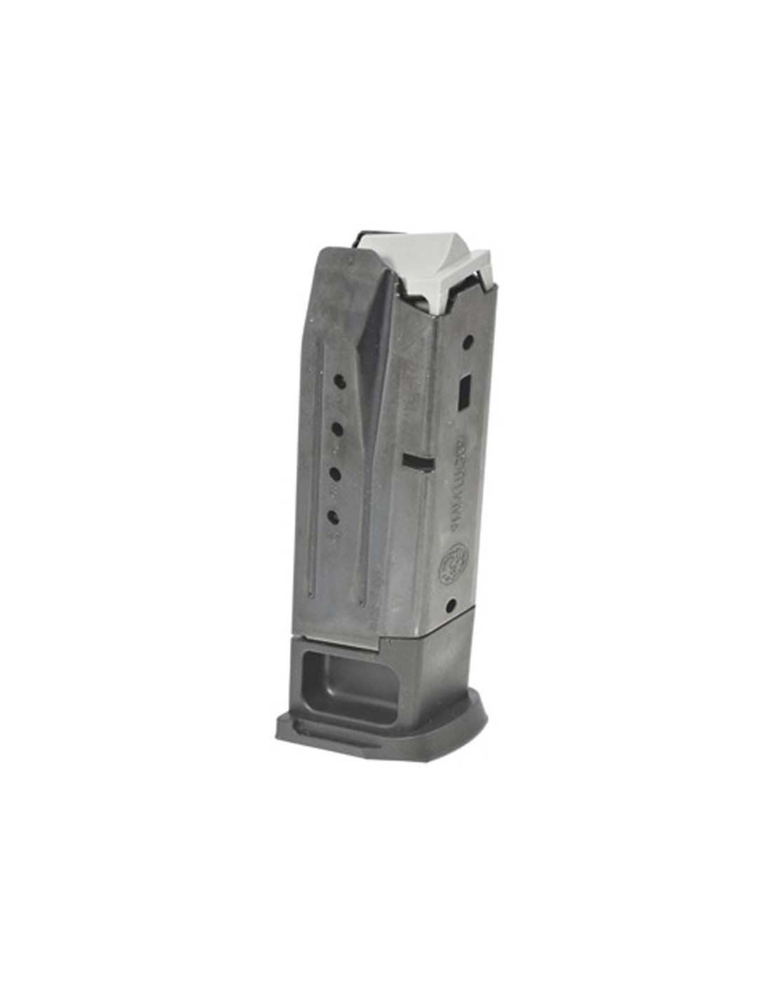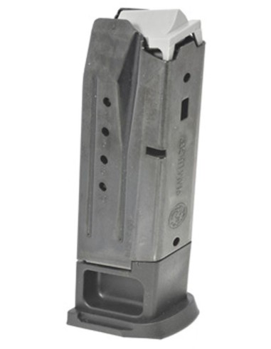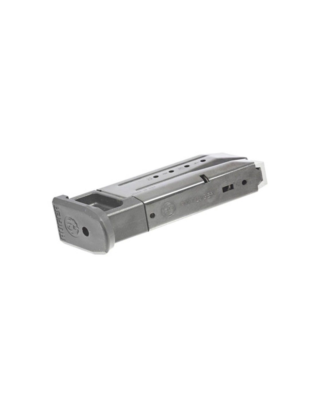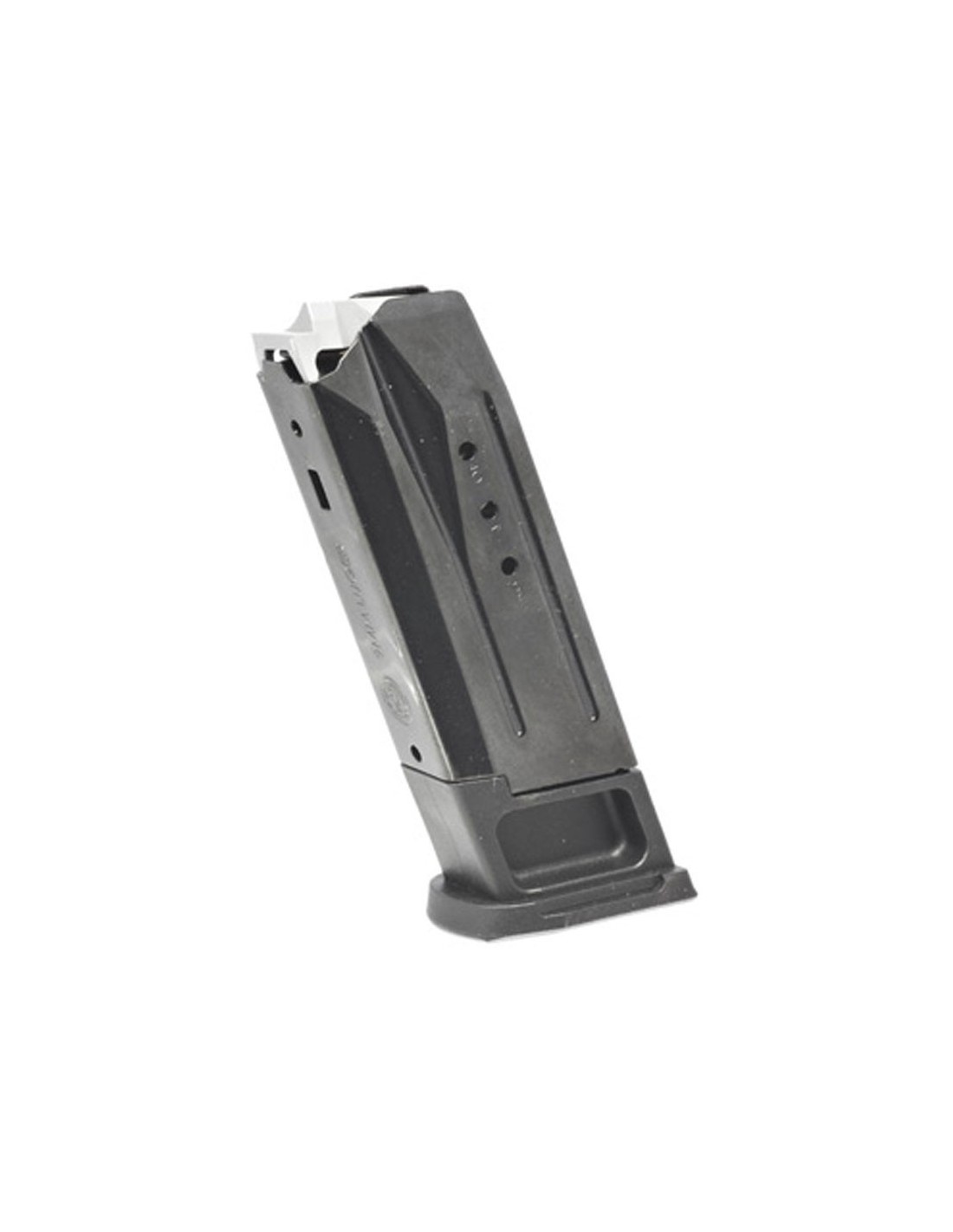 Cargador metálico en pavonado negro con capacidad para 10 balas compatible con la pistola Ruger Security-9, Ruger PC Carbine y Ruger PC Charger con el inserto de cargador SR9/S9 instalado. Accesorio de fábrica original Ruger.