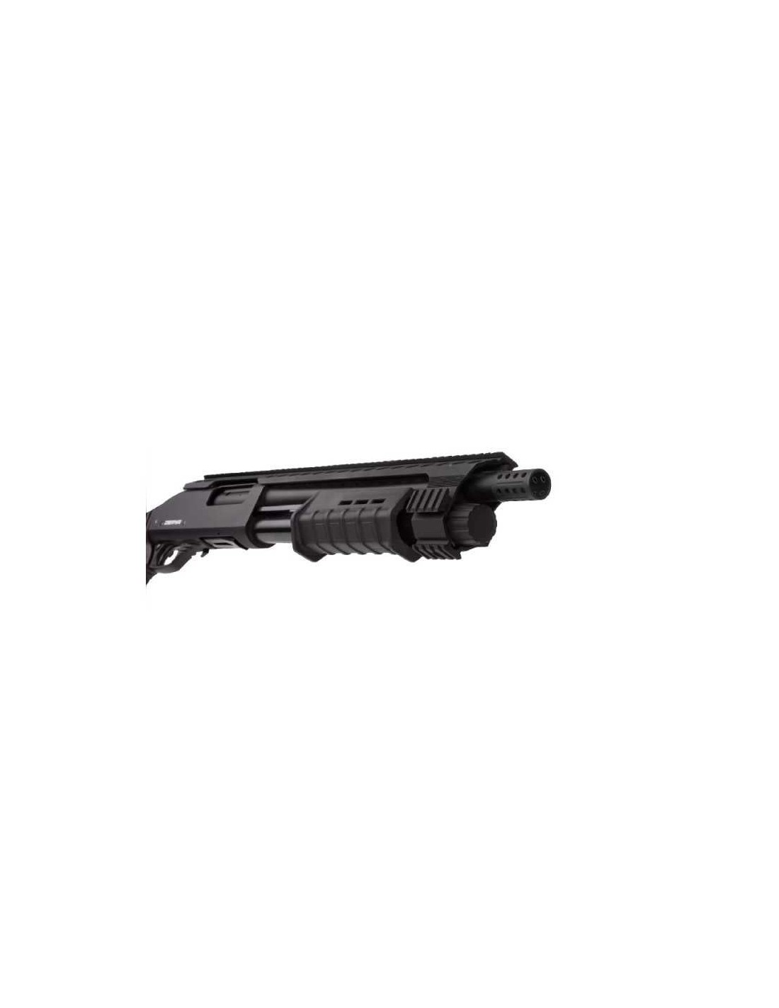 Se encuentran rieles para accesorios en la parte delantera, derecha, izquierda e inferior junto al receptor del arma. Además, el guardamonte está diseñado con canales que evitan el deslizamiento y el ruido se reduce gracias al freno de boca.