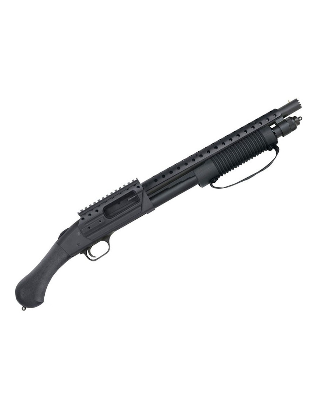 La Mossberg 590 Shockwave es una escopeta muy compacta de tan solo 67 cm. de longitud. Se caracteriza por tener una empuñadura de pistola “Raptor”, fabricada en polímero muy resistente con un acabado texturizado mejorado, y su forma de "cabeza de pájaro” que permite un control máximo del arma y minimiza el retroceso. El guardamanos táctico viene con correa para un mayor control y un funcionamiento más suave.
