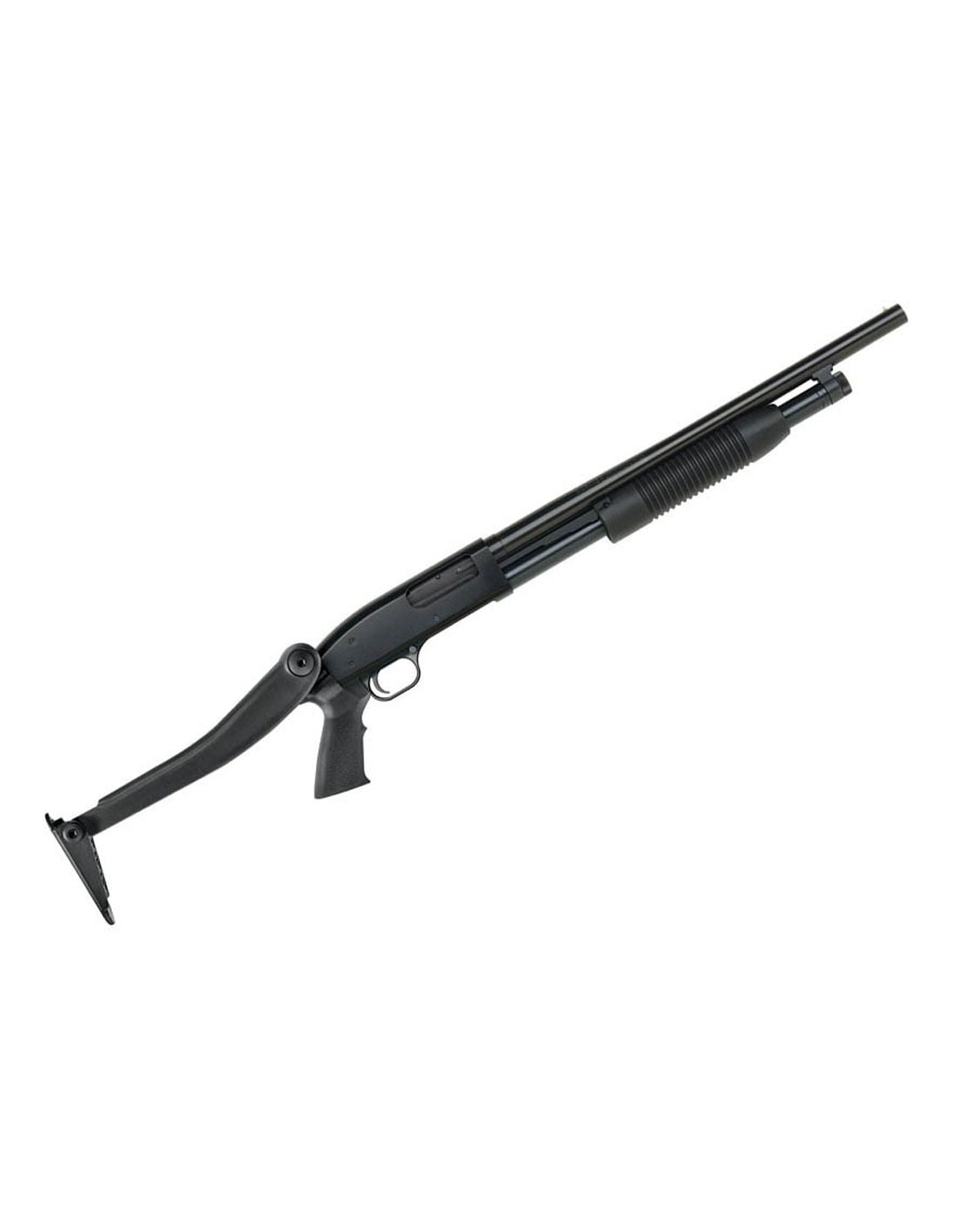 Con la incorporación de la culata plegable superior Shotforce® de ATI, esta Maverick 88 se puede transportar de forma compacta en su posición plegada o en una configuración de empuñadura de pistola plegando la culata por la parte superior, evitando interferencia con la operación del arma, pudiendo apuntar y disparar indistintamente con la culta plegada o extendida. Para disparar desde una posición montada en el hombro, simplemente baje la culata presionando el botón de liberación rápida. La culata está construida en polímero reforzado y presenta una empuñadura de pistola con textura.