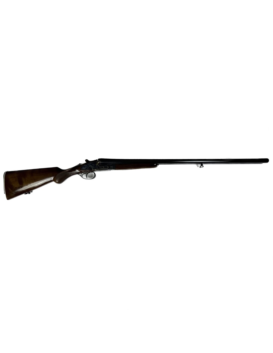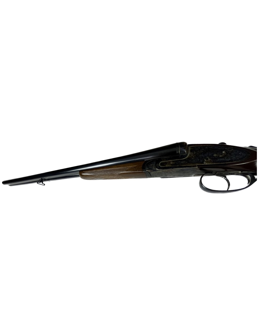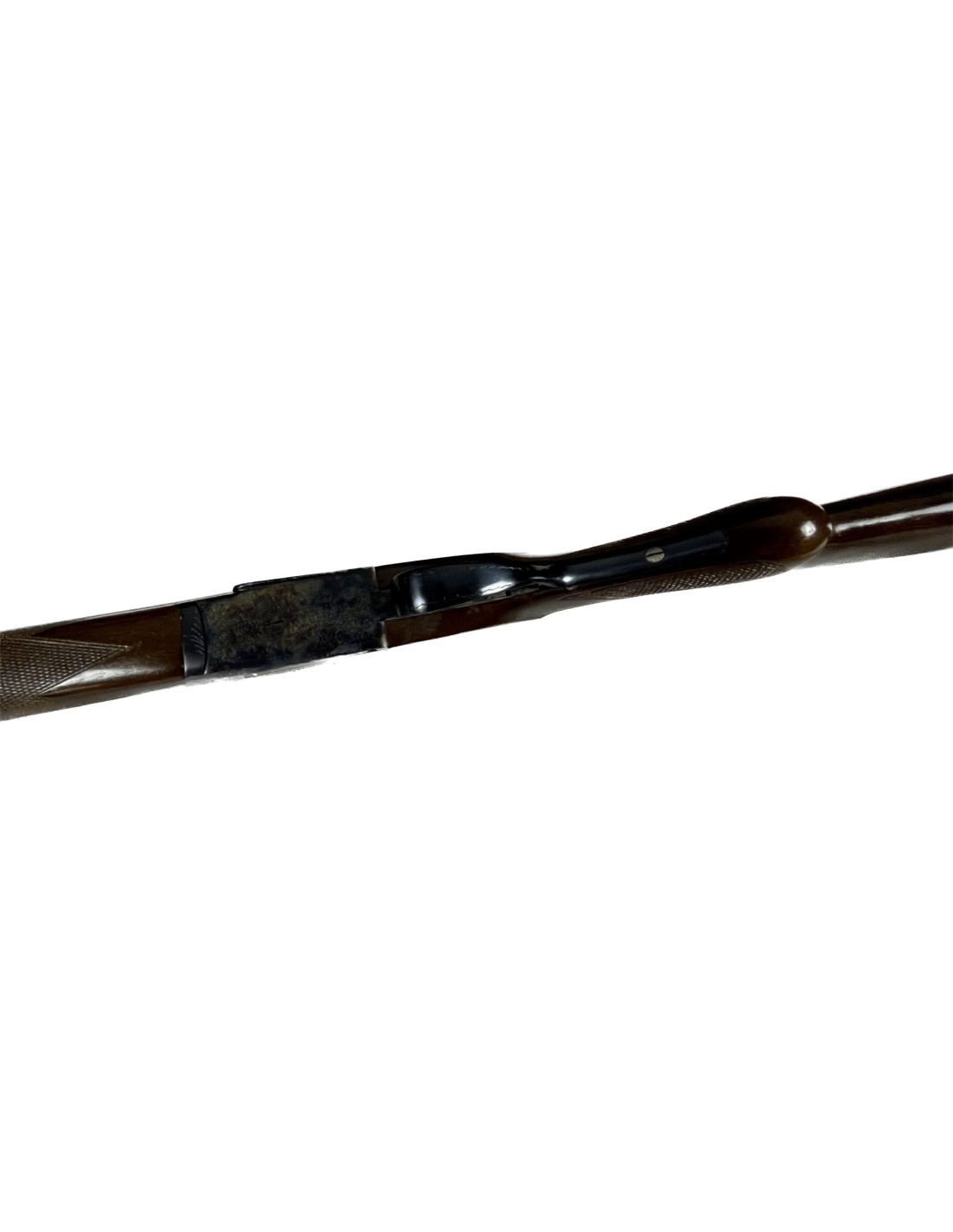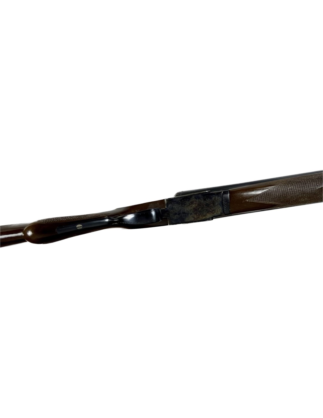 Escopeta Paralela Miguel Larrañaga calibre 12, cañón 71 cm, extractora, ánima 18.4 mm, choques fijos 3 y 1*, banda recta sporting. Nueva, sin uso, solo expuesta en exposición.