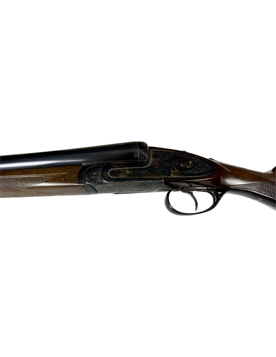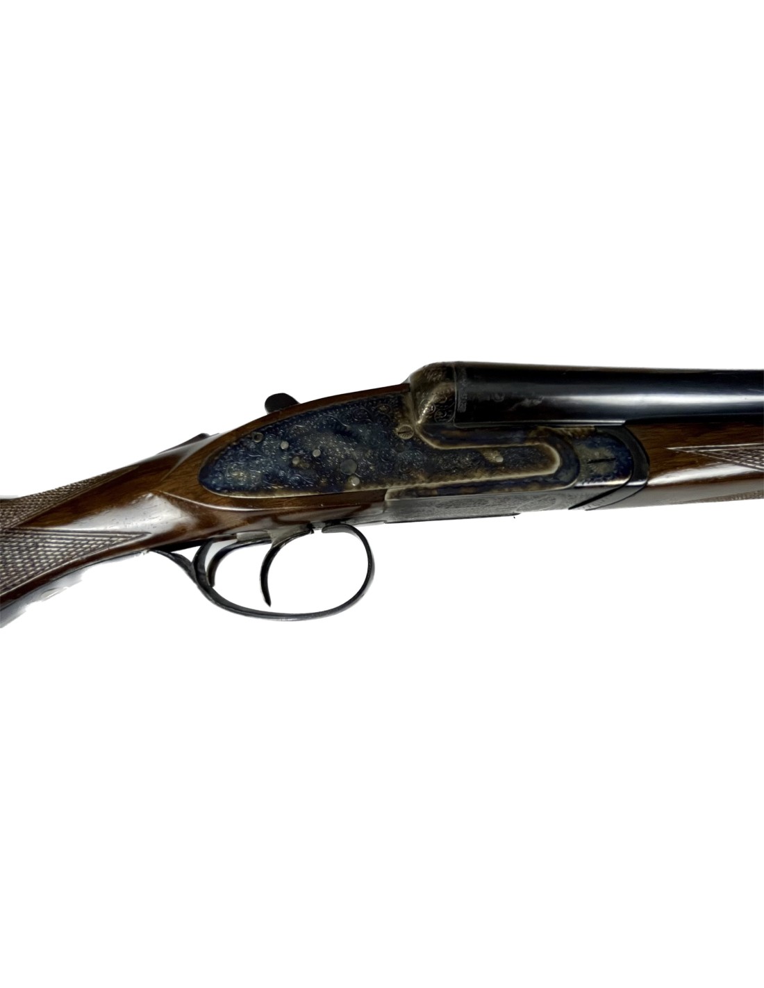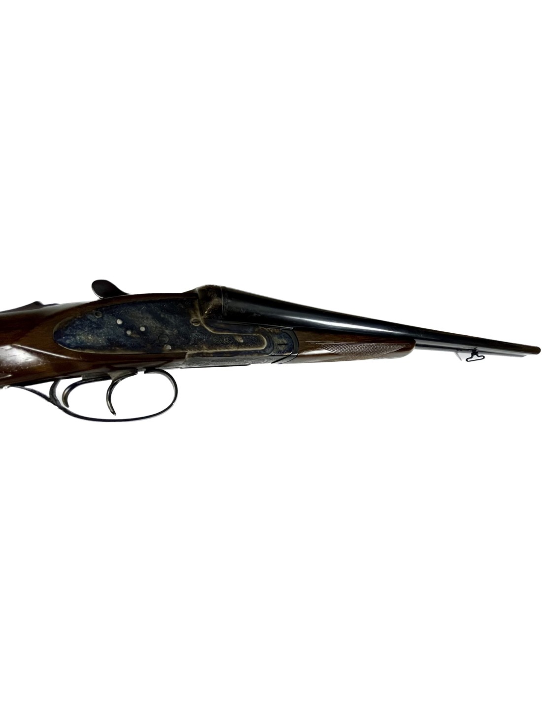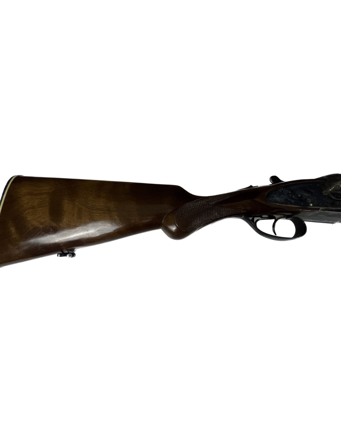 Escopeta Paralela Miguel Larrañaga calibre 12, cañón 71 cm, extractora, ánima 18.4 mm, choques fijos 3 y 1*, banda recta sporting. Nueva, sin uso, solo expuesta en exposición.