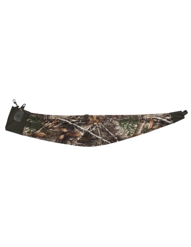 Su confección en poliéster afelpado garantiza un manejo silencioso, evitando ruidos durante el transporte o la caza. Los refuerzos de ripstop situados en la parte frontal y posterior aumentan la resistencia estructural frente a roces o desgarros, mientras que el cierre elástico inferior permite un ajuste preciso a diferentes longitudes de arma, desde 118 cm hasta 135 cm.