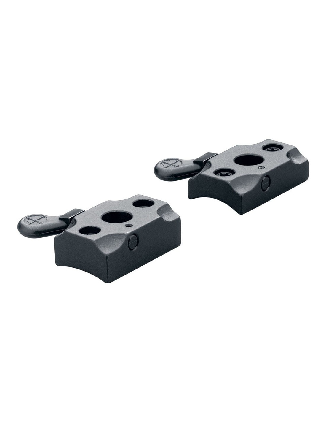 Las monturas QR se desmontan y montan rápidamente. Se gira la palanca hacia adelante y una excéntrica en el eje de la palanca engancha la base del anillo, tirando de ella hacia abajo y hacia adelante en la base, asegurándola sólidamente en su posición "cero".