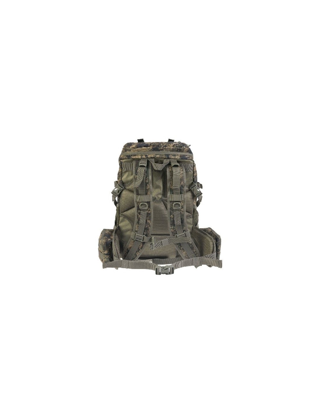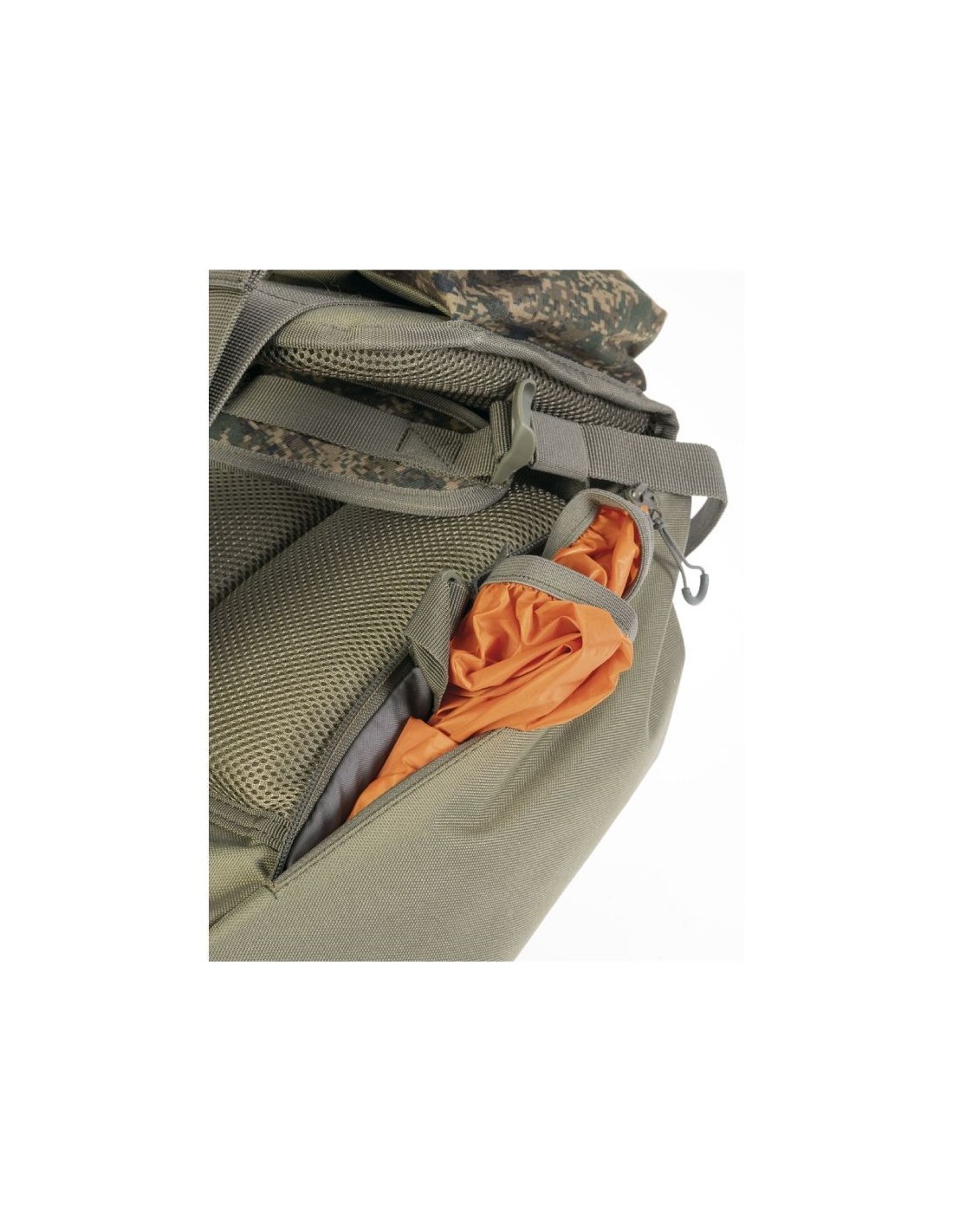 Gran bolsillo trasero con tapa superior, molle y correas para carga adicional