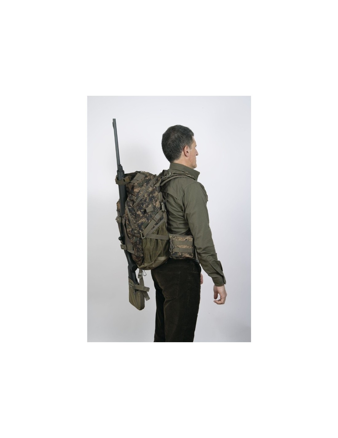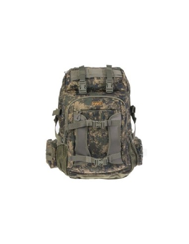 Mochila técnica, silenciosa y resistente al agua, ideal para jornadas de caza. Con sistema de sujeción para rifle, camuflaje Pixel Forest y gran capacidad de carga.