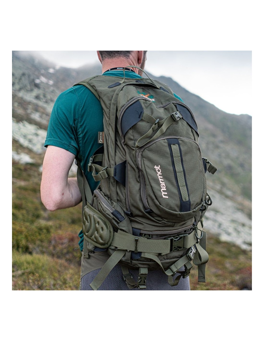 Mochila de caza ergonómica, con sistema FREEDOM AIR MESH en la zona lumbar. Cinturón ergonómico, acolchado y perforado, con correas acolchadas ajustables para los hombros y correa deslizante para el pecho con silbato de emergencia. Amplios bolsillos frontales para accesorios con numerosos compartimentos. Equipada con funda extraíble para rifle situada en la parte inferior y correas de retención. Compatible con sistema/bolsa de hidratación y funda protectora impermeable para lluvia extraíble en la base de la mochila.