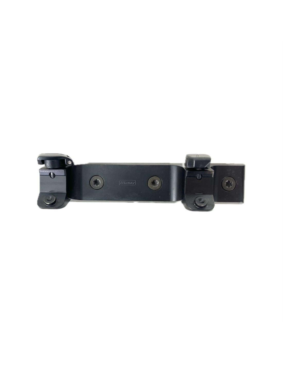 Montura Blaser alta para carril Zeiss de segunda mano, diseñada específicamente para visores con carril Zeiss y rifles del sistema Blaser. Su altura permite montar visores con objetivos de gran diámetro (como 56 mm) o dejar espacio adicional para el uso de moderadores de sonido o miras auxiliares, sin comprometer el encare ni la precisión.