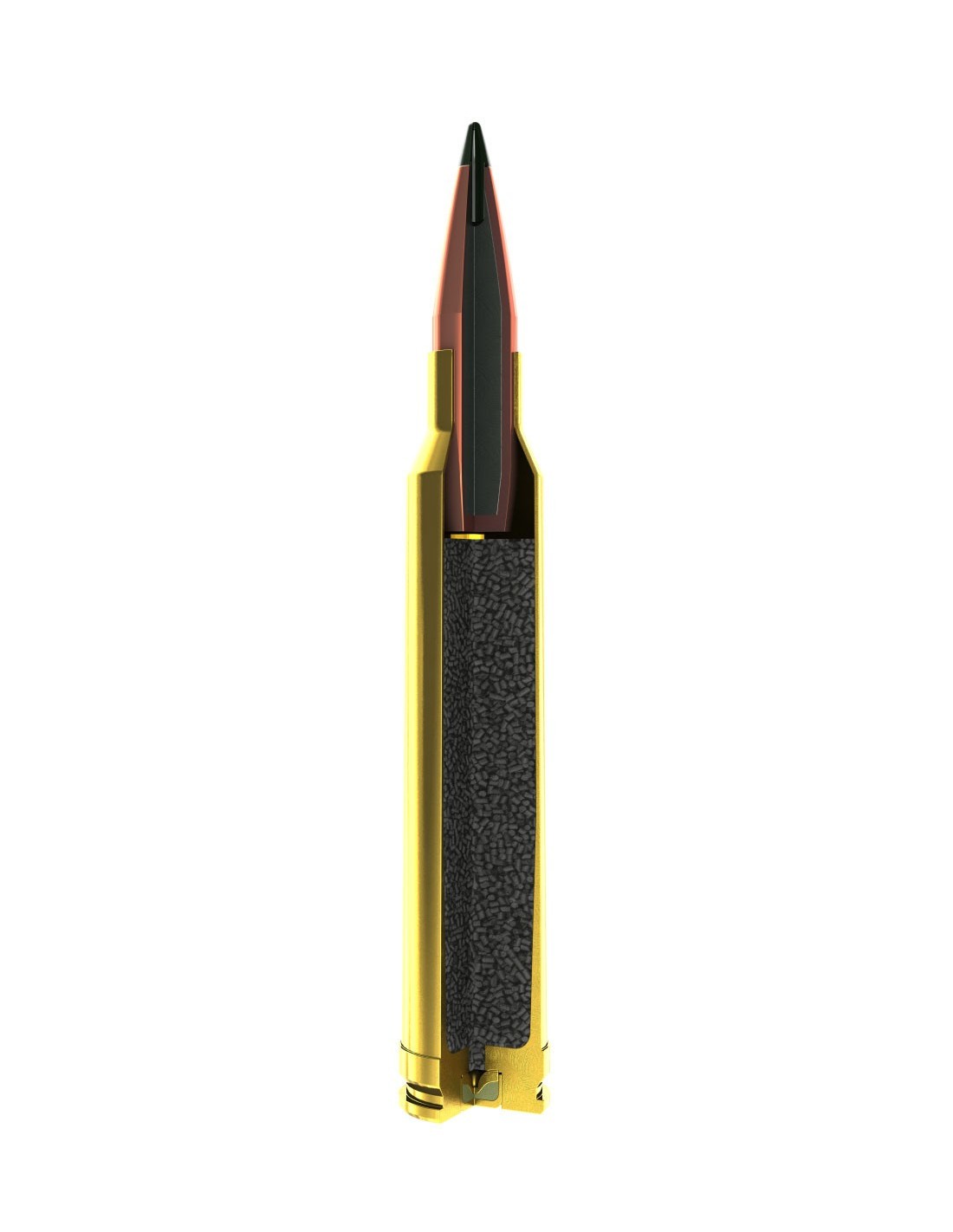 - Camisa y núcleo de bala fusionados químicamente diseñados para detener la separación e impartir la máxima energía retenida e impacto de peso en el objetivo.