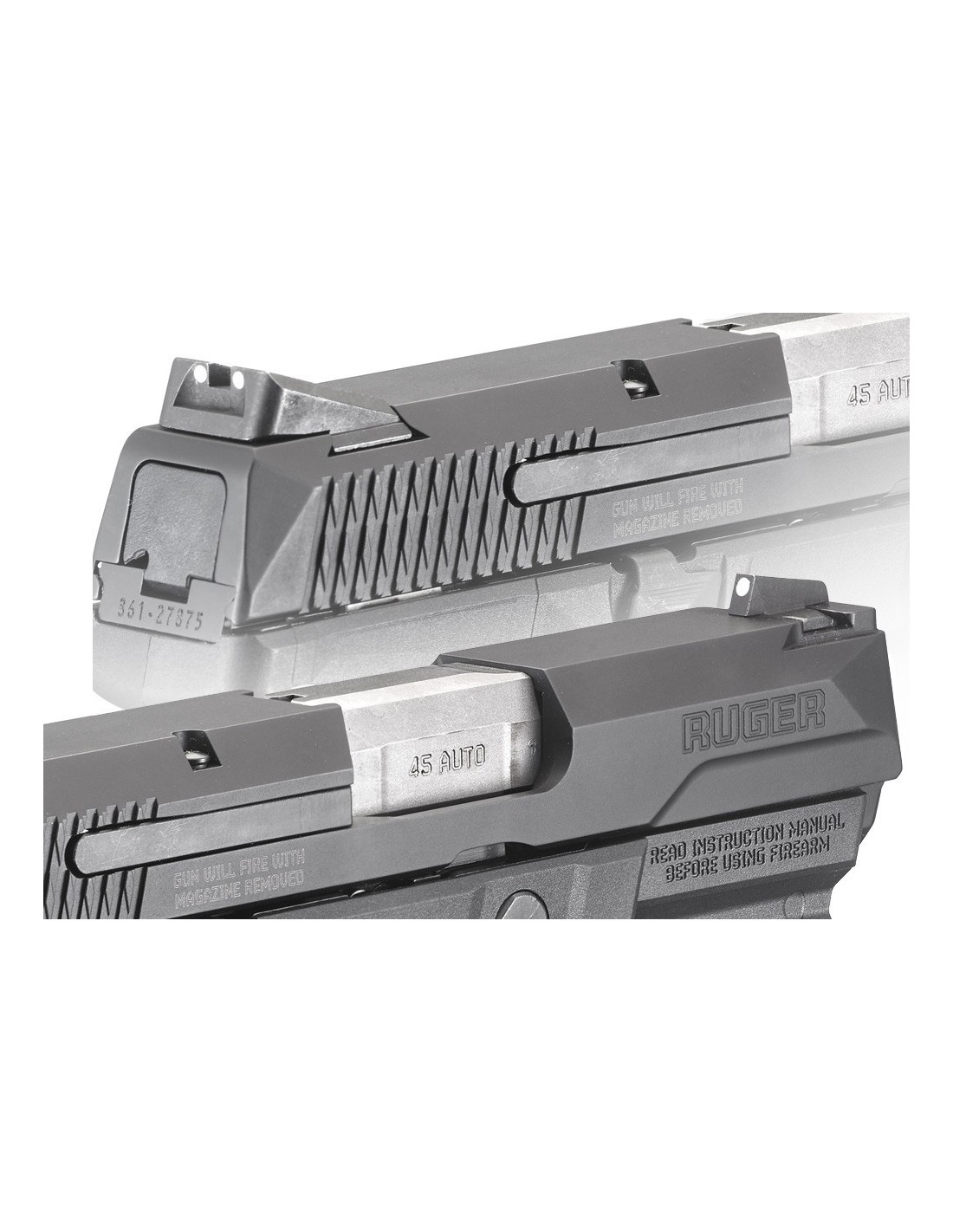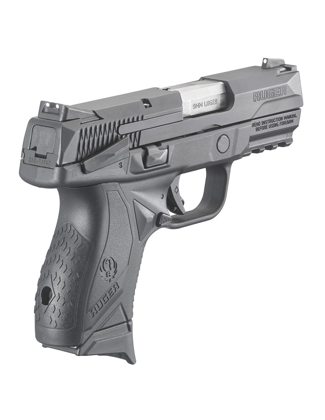 Cada pistola Ruger American está fabricada sobre un chasis rígido de una sola pieza de acero inoxidable nitrurado negro, mecanizado con precisión. Entre sus características adicionales se incluyen miras de tres puntos Novak® LoMount Carry originales, una corredera de acero inoxidable con acabado de nitruro negro anti reflectante, un armazón de empuñadura de nailon reforzado con fibra de vidrio de una sola pieza y de alto rendimiento, y un carril Picatinny MIL-STD-1913 para accesorios que cumple con el estándar militar.