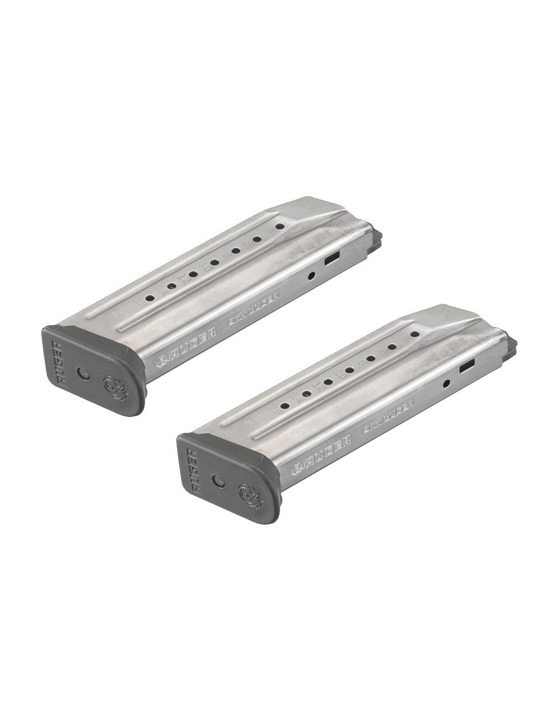 Cada pistola se entrega en un estuche rígido con módulos de empuñadura reemplazables y dos cargadores de acero niquelados con teflón.