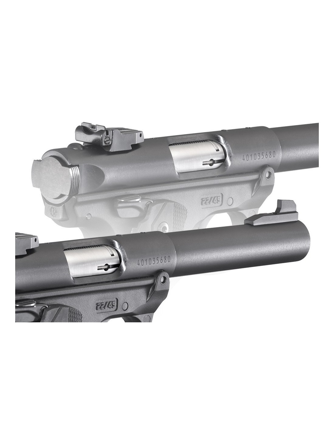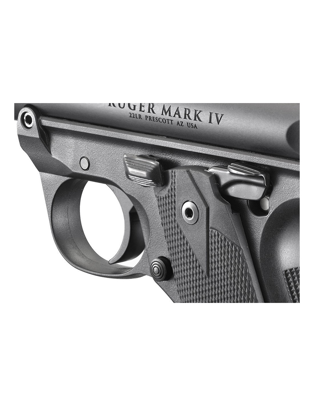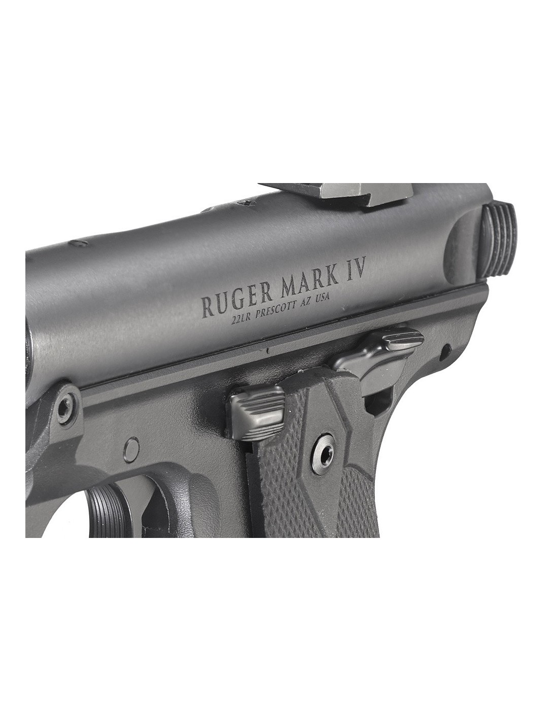 Ahora lanza la nueva línea de pistolas Ruger Mark IV, que mantiene la misma apariencia exterior clásica que la icónica Mark III, pero que incorpora una mejora significativa: un desmontaje simple con un solo botón para una extracción rápida y fácil. Un botón empotrado en la parte posterior del armazón permite que el receptor superior se incline hacia arriba y fuera del armazón sin el uso de herramientas. El cerrojo simplemente se desliza fuera del receptor y el cañón se puede limpiar adecuadamente desde la recámara hasta la boca.