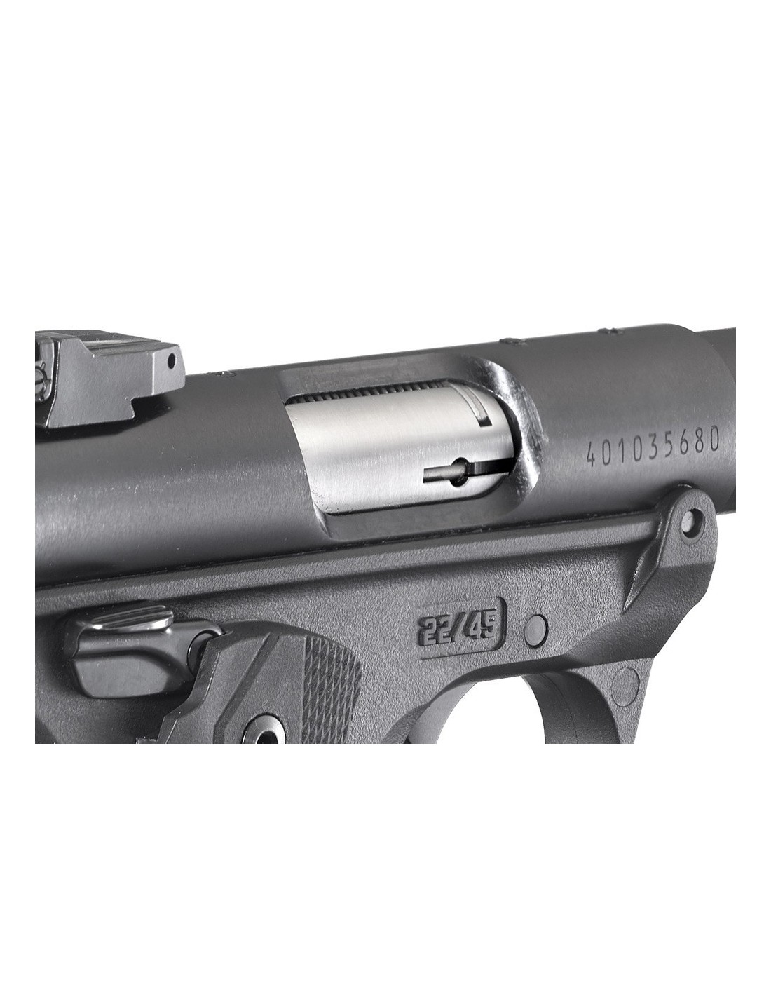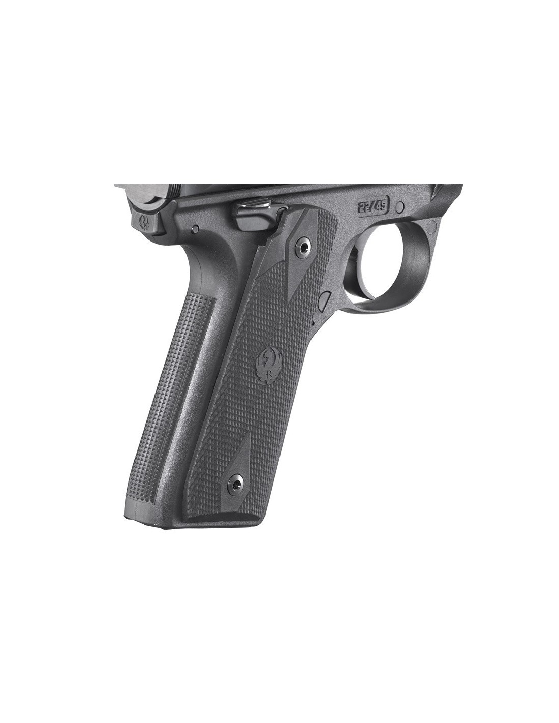 La versión 22/45 de la Ruger Mark IV está contribuida con un armazón de polímero moldeado a precisión. Trae seguro manual ambidiestro y un tope de cerrojo rediseñado para una operación más ergonómica. El cargador cae libremente al soltarlo para recargas más rápidas y un seguro de desconexión del cargador rediseñado evita la descarga cuando se retira el cargador. Las mejoras internas incluyen cambios en el martillo, el fiador, el cerrojo y el percutor para una alimentación más suave y fiable.