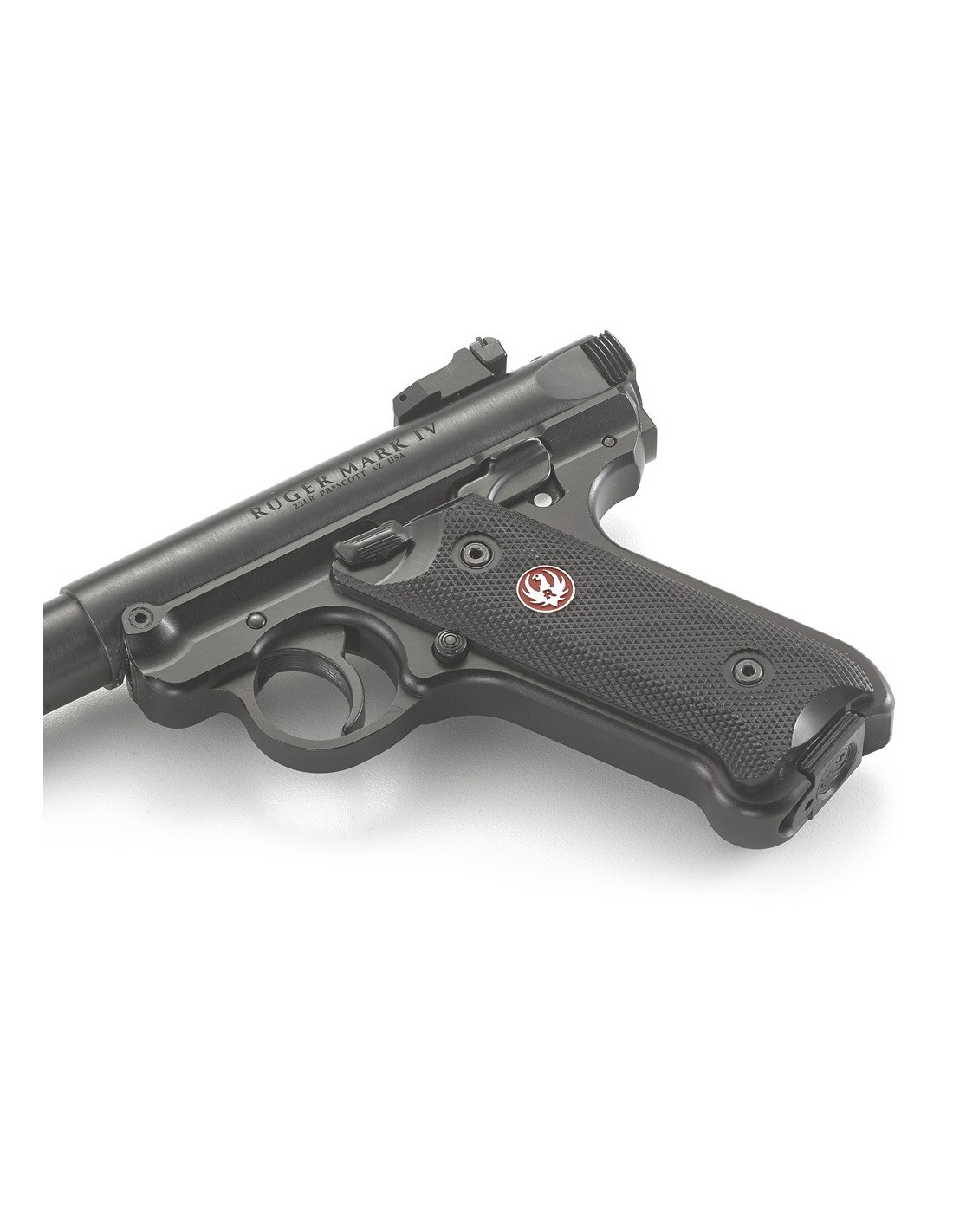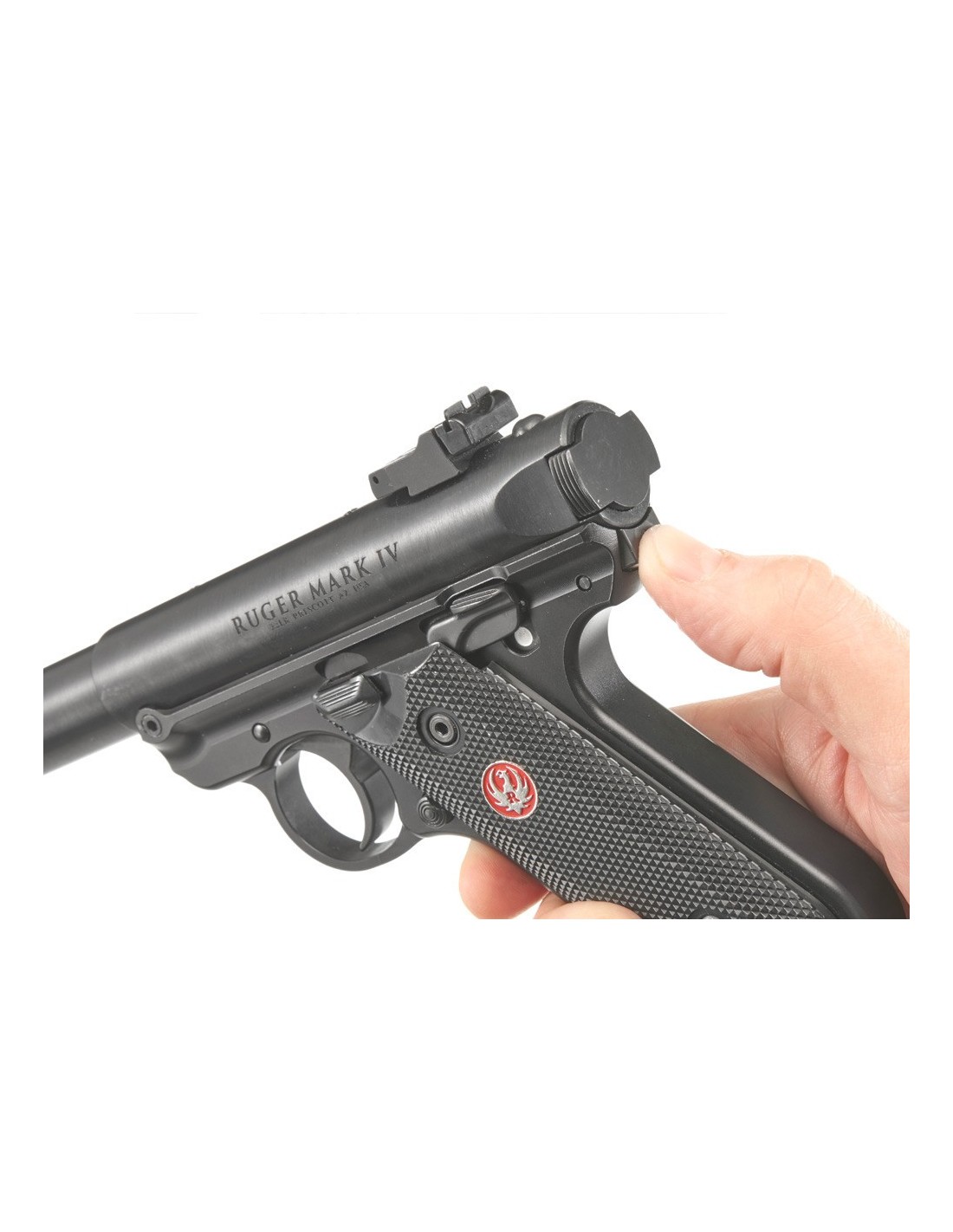 Ahora lanza la nueva línea de pistolas Ruger Mark IV, que mantiene la misma apariencia exterior clásica que la icónica Mark III, pero que incorpora una mejora significativa: un desmontaje simple con un solo botón para una extracción rápida y fácil. Un botón empotrado en la parte posterior del armazón permite que el receptor superior se incline hacia arriba y fuera del armazón sin el uso de herramientas. El cerrojo simplemente se desliza fuera del receptor y el cañón se puede limpiar adecuadamente desde la recámara hasta la boca.