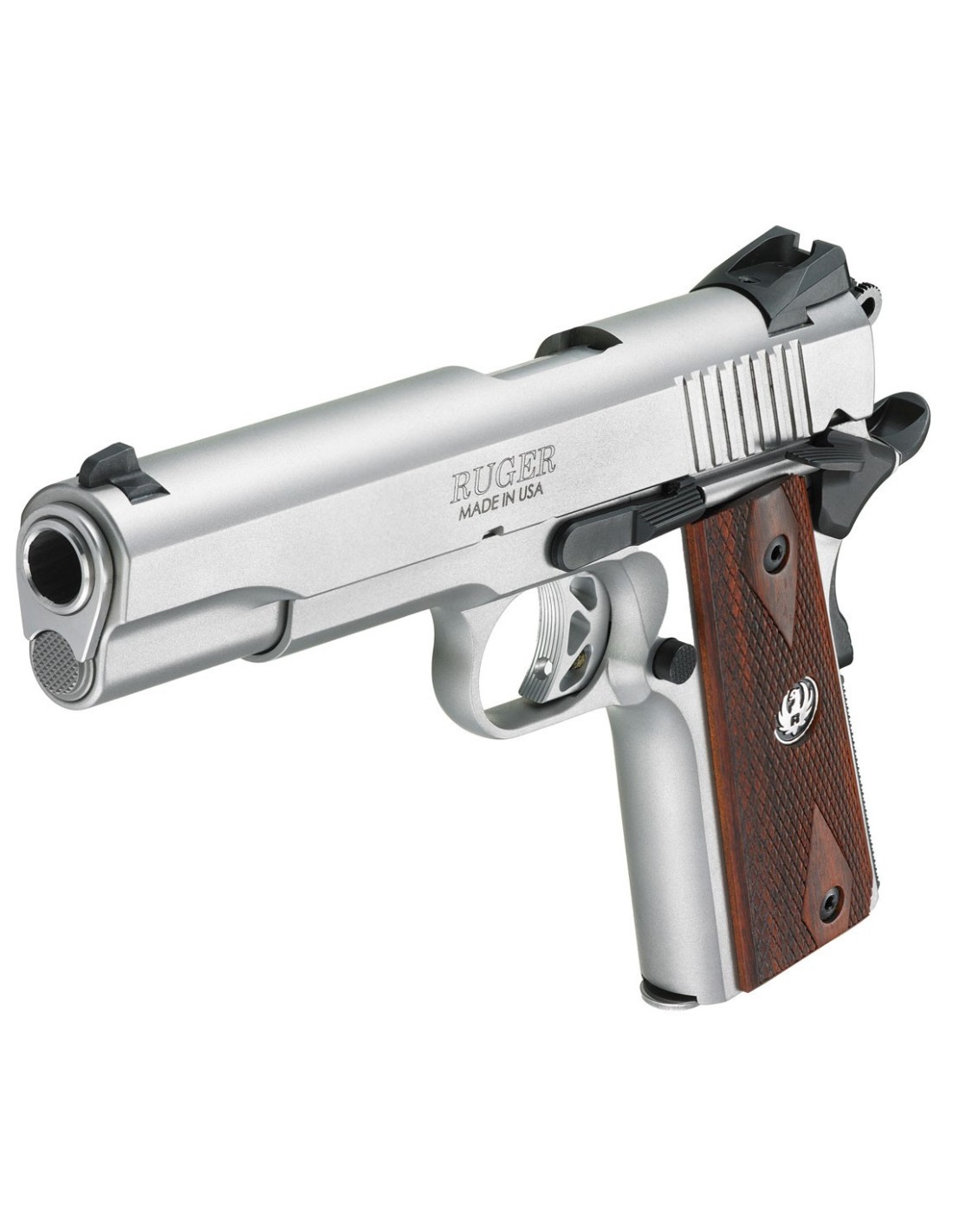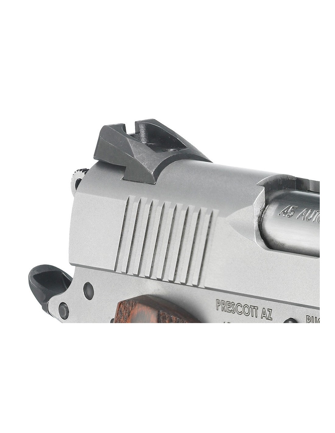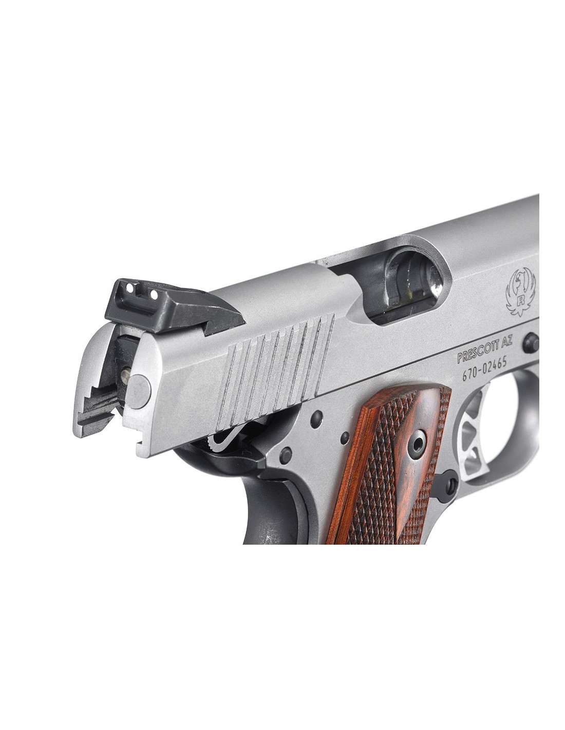 La pistola Ruger SR1911 de acción simple presenta armazón y corredera de acero inoxidable granallado y mecanizado con precisión por CNC para un ajuste preciso entre ambas partes. El cañón y el bushing de acero inoxidable se fabrican simultáneamente, a partir de la misma barra de calidad usada en artillería, para un mayor ajuste y una precisión mejorada. La corredera presenta aserraduras traseras y un sistema de mira de tres puntos compuesto de un alza trasera Novak® y una mira delantera estándar.