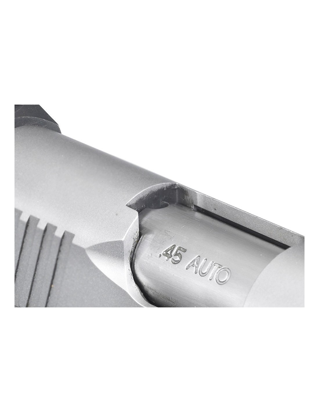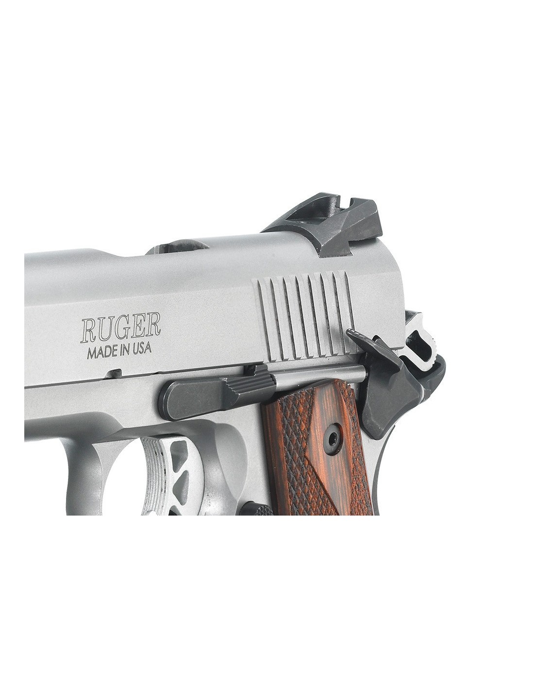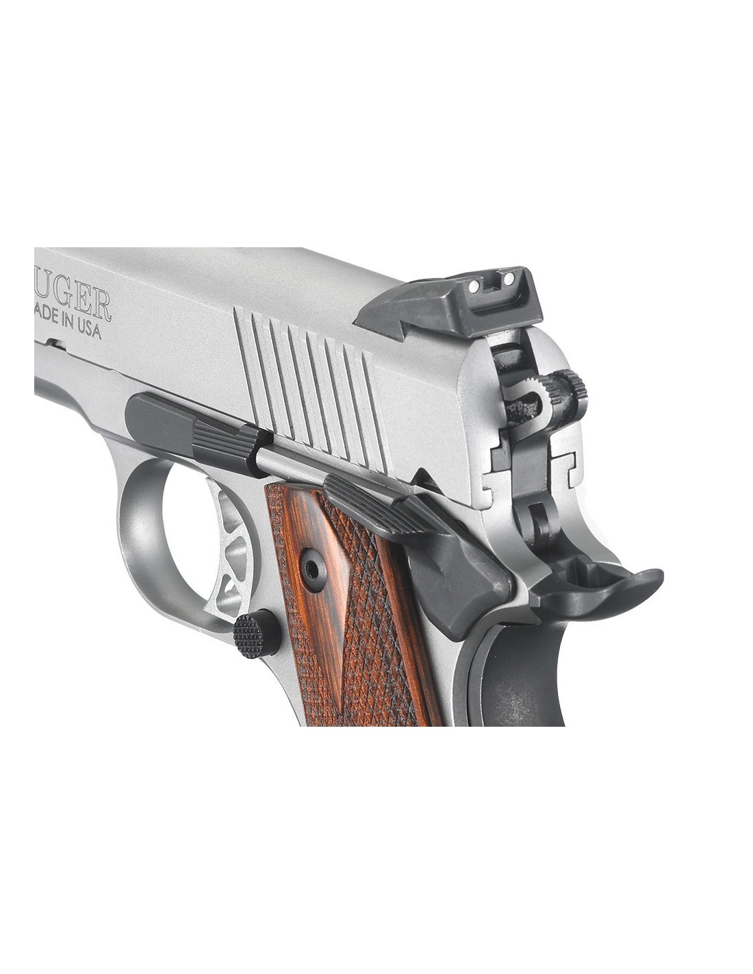 La pistola Ruger SR1911 de acción simple presenta armazón y corredera de acero inoxidable granallado y mecanizado con precisión por CNC para un ajuste preciso entre ambas partes. El cañón y el bushing de acero inoxidable se fabrican simultáneamente, a partir de la misma barra de calidad usada en artillería, para un mayor ajuste y una precisión mejorada. La corredera presenta aserraduras traseras y un sistema de mira de tres puntos compuesto de un alza trasera Novak® y una mira delantera estándar.