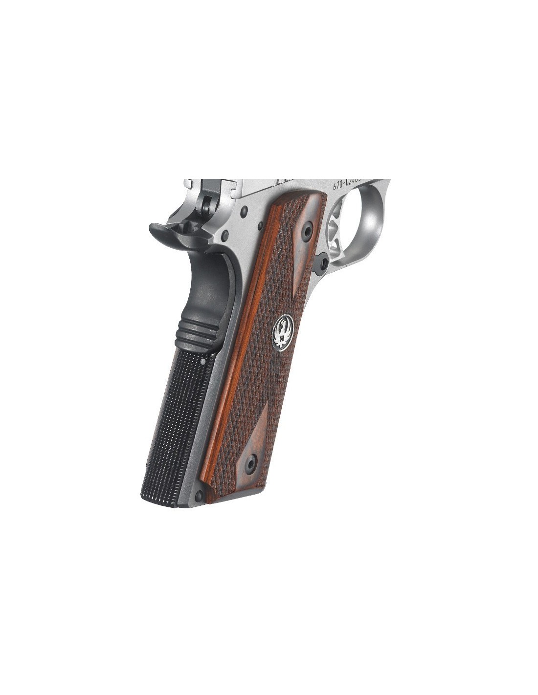 La empuñadura de la Ruger SR1911 cuenta con el logotipo de Ruger en paneles de madera con picados a cuadros. Cada pistola se envía con un cargador de acero inoxidable de 7 balas y otro de 8 balas, una llave para el bushing y un estuche blando. La SR1911 se adapta a la mayoría de las fundas disponibles actualmente.