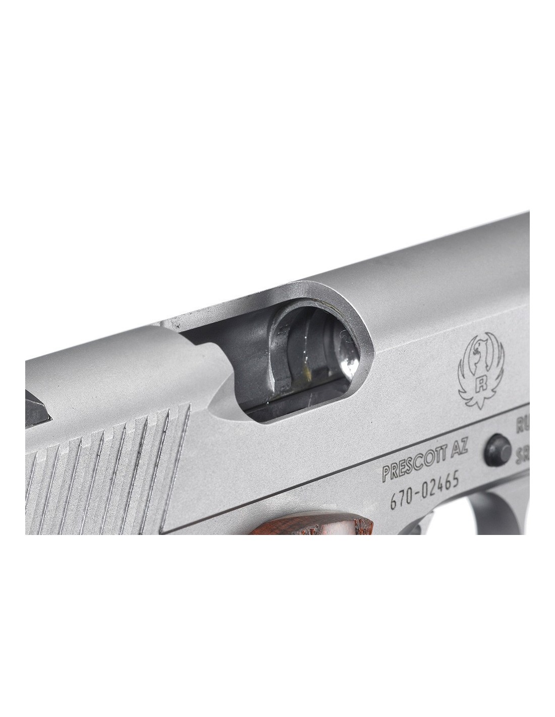La Ruger SR1911 cuenta con un percutor de titanio y un resorte de percutor pesado, lo que elimina la necesidad de un bloque de percutor, ofreciendo una característica de seguridad actualizada al diseño original ""Serie 70"" sin comprometer el peso del disparador. Un seguro manual de pulgar extendido ofrece una mejor manipulación y un seguro de agarre en la empuñadura de gran tamaño proporciona una función positiva y fiable. Un puerto de inspección visual ofrece confirmación de que hay una bala en la recámara.
