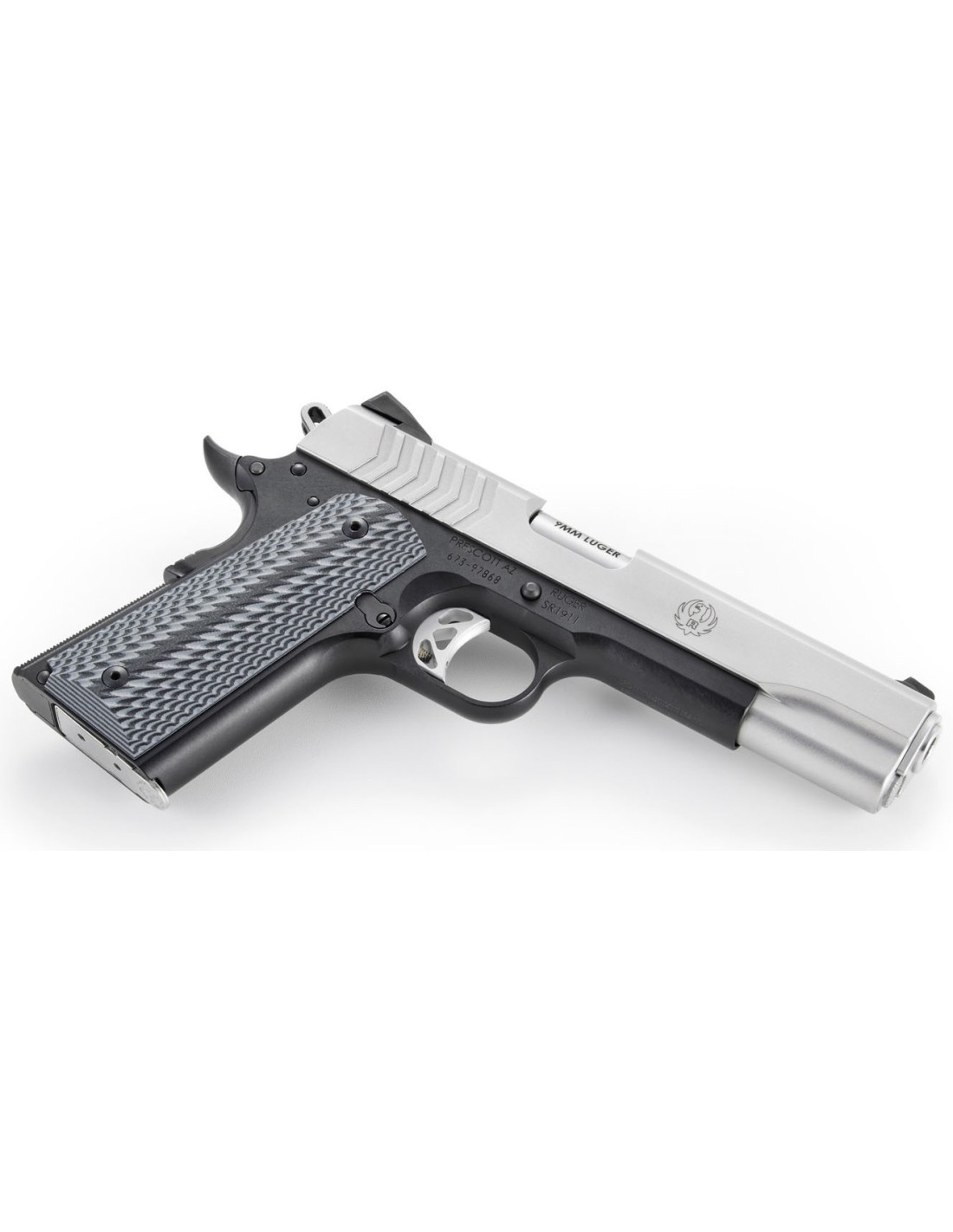 La pistola Ruger SR1911 de acción simple en calibre 9mm Pb. Parabellum trae armazón de aluminio y corredera de acero inoxidable granallado y mecanizado con precisión por CNC para un ajuste preciso entre ambas partes. El cañón y el bushing de acero inoxidable se fabrican simultáneamente, a partir de la misma barra de calidad usada en artillería, para un mayor ajuste y una precisión mejorada. La corredera presenta aserraduras traseras y un sistema de mira de tres puntos compuesto de un alza trasera Novak® y una mira delantera estándar.