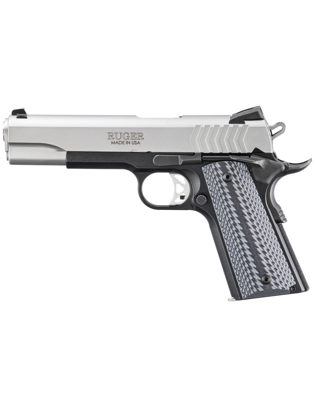 La empuñadura de este modelo de la Ruger SR1911 viene con paneles de agarre G-10. Cada pistola se envía con dos cargadores de acero inoxidable y llave para el bushing. La SR1911 se adapta a la mayoría de las fundas disponibles actualmente.