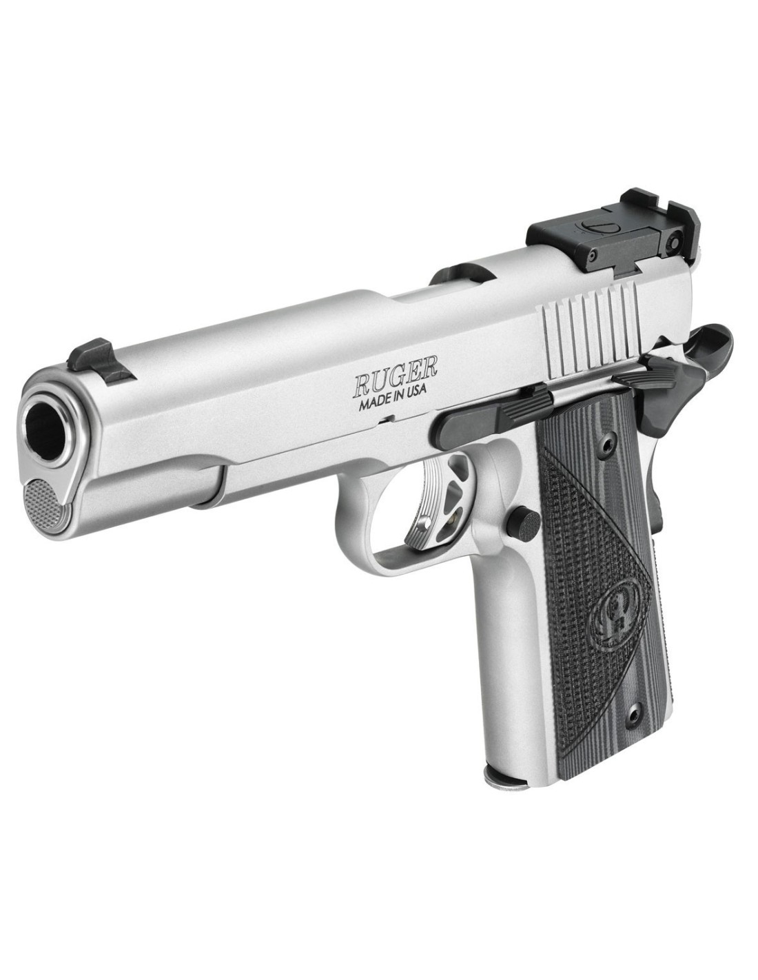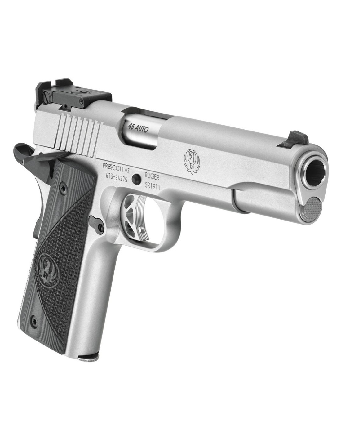 El nuevo modelo Target de la popular pistola Ruger SR1911 en calibre 9mm Pb. Parabellum cuenta con un alza trasera totalmente ajustable estilo ""Bomar"" y un seguro manual extendido y ambidiestro. Esta nueva SR1911 en acero inoxidable con acabado satinado también cuenta con controles ennegrecidos y empuñadura con paneles de agarre texturizados G-10 Deluxe.