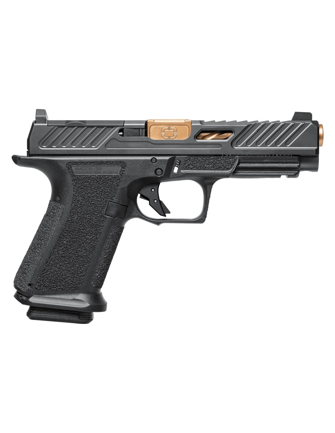 - Corredera de acero inoxidable 17-4 y cañón de acero inoxidable 416R, ambos en acabado nitruro negro.