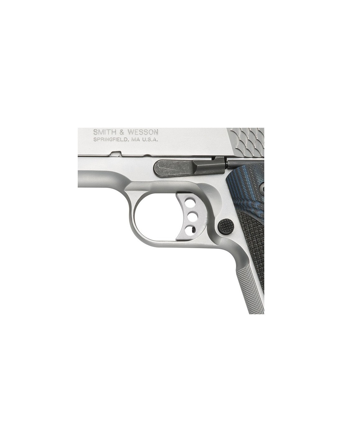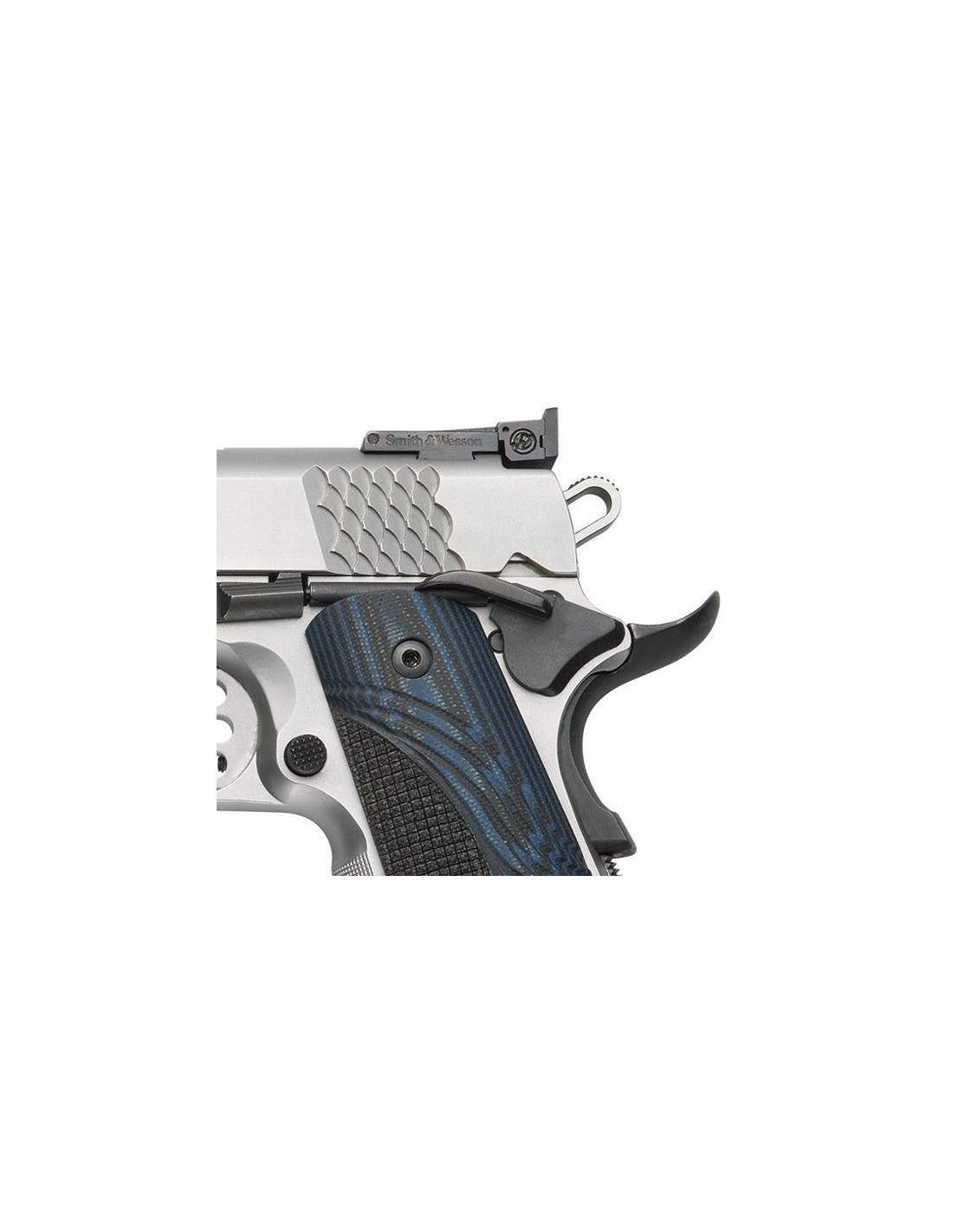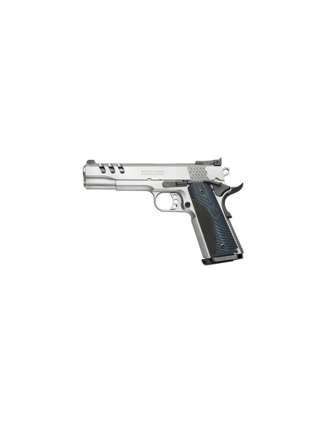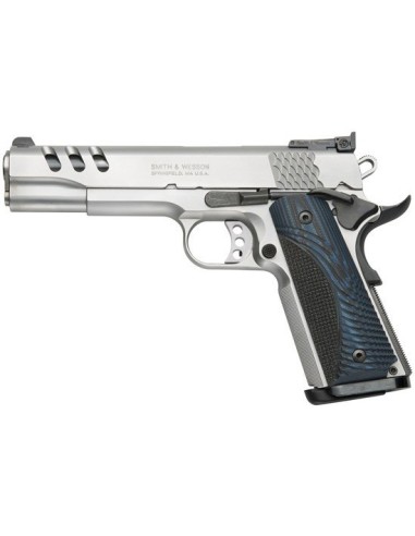 Pistola basada en el diseño que hizo popular John Moses Browning hace mas de 100 años, ahora fabricada por SMITH&WESSON con nuevas características y con los mejores materiales actuales. Con palanca de seguro ambidiestro en el armazón y tecla de seguro en la empuñadura. Corredera y armazón en acero inoxidable bitono. Alza ajustable y punto de mira en poste negro. Cachas de madera de nogal. Disparador de competición Match y armazón largo.