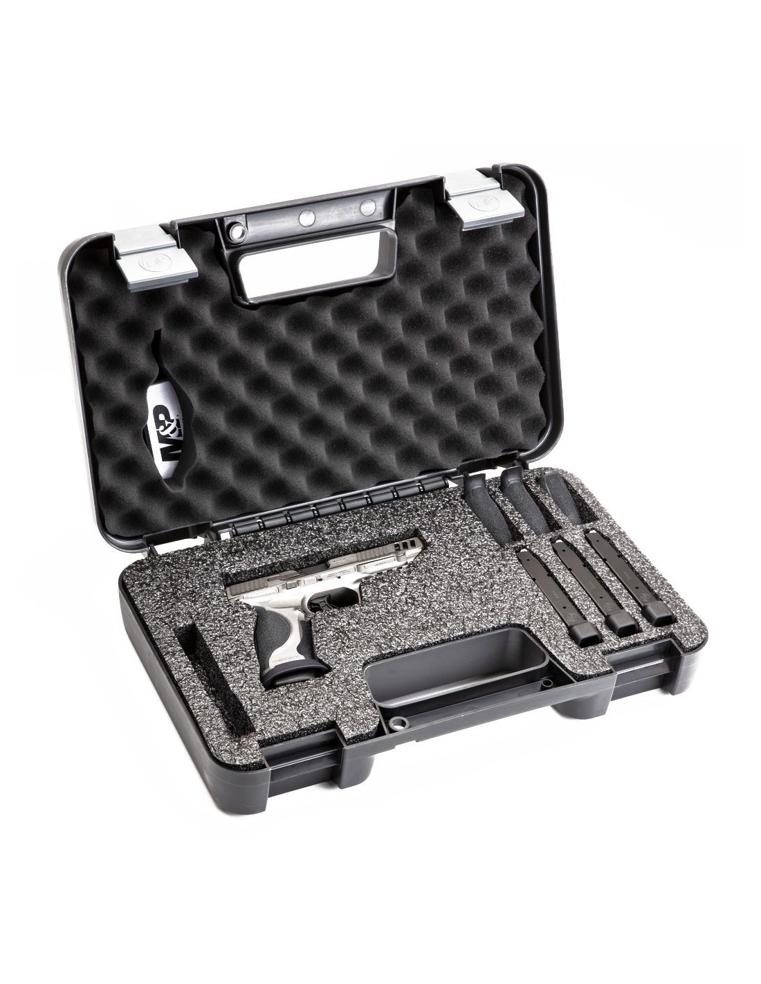 La pistola M&P M2.0, la última innovación en la respetada línea de pistolas de polímero M&P. Diseñada para uso personal, deportivo y profesional, la M&P M2.0 ofrece una plataforma completamente nueva, que presenta características innovadoras en casi todos los aspectos de la pistola, incluido el gatillo, la empuñadura, el marco y el acabado. Los aspectos más destacados de la pistola M&P M2.0 incluyen un chasis de acero inoxidable extendido y una alta relación entre el agarre y el eje del orificio del cañón para reducir la elevación de la boca y una recuperación más rápida del objetivo. La pistola M&P M2.0 mejora aún más el rendimiento con un gatillo más nítido y afinado, un tirón más ligero y un reinicio táctil y audible. La pistola incluye una empuñadura de textura agresiva y cuatro inserciones palmswell intercambiables para un ajuste óptimo en la mano y alcance del gatillo.