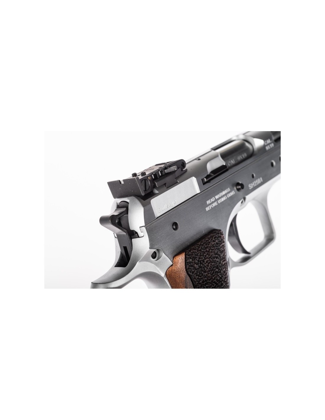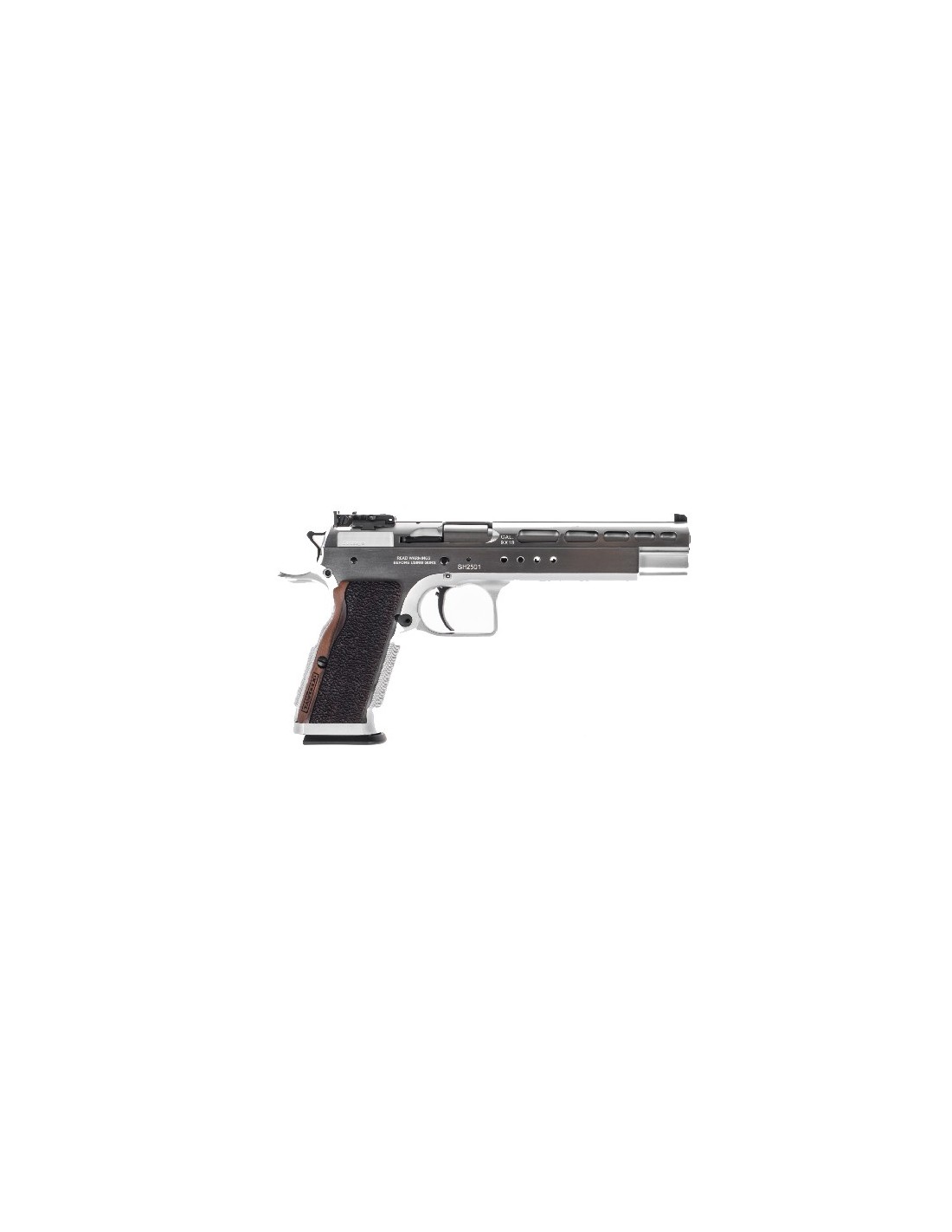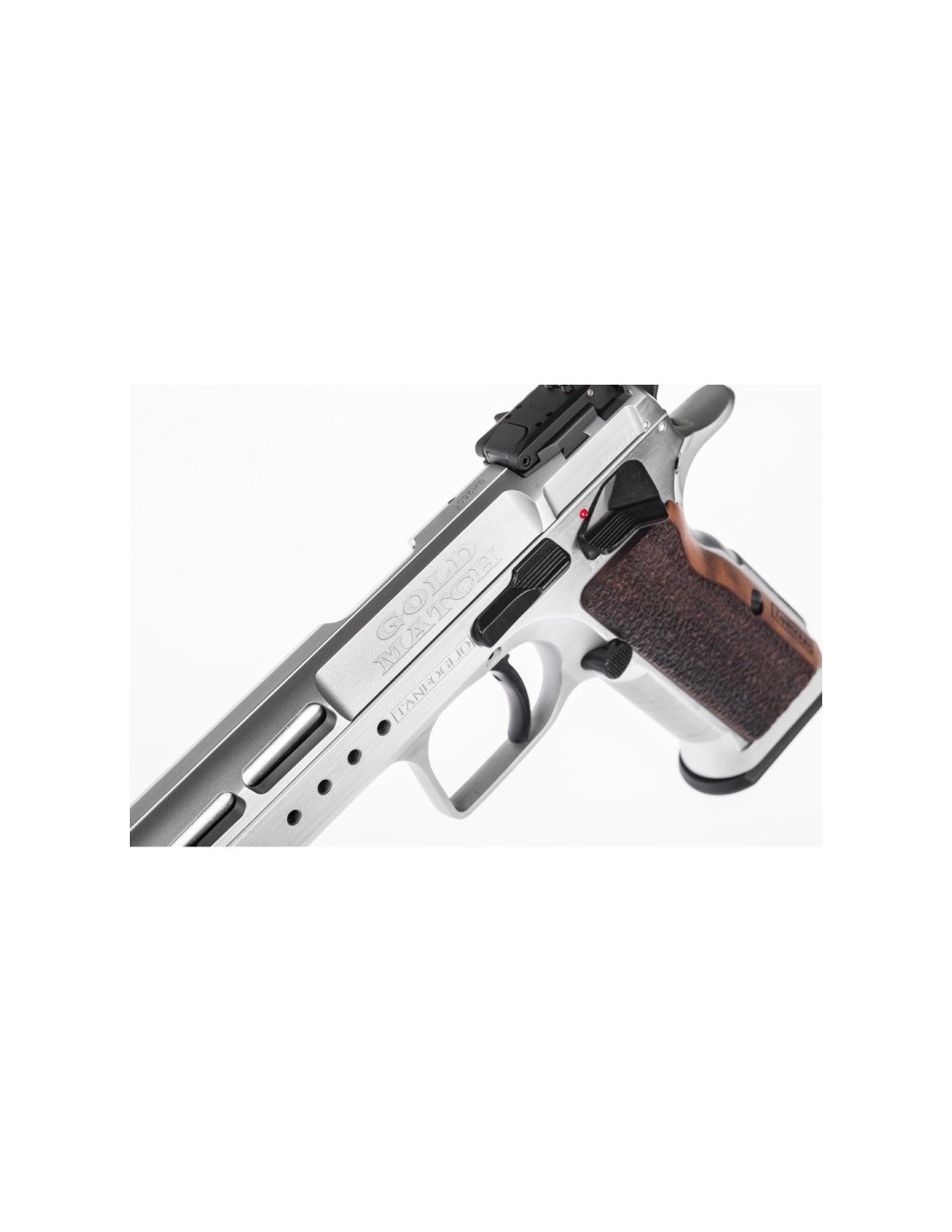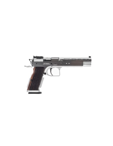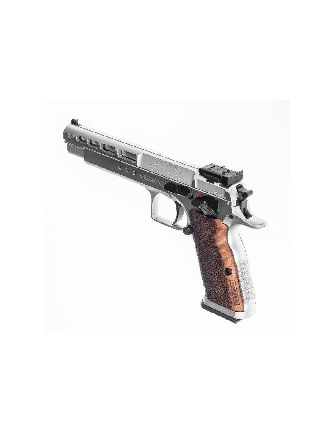 La Tanfoglio Gold Match Bullseye 9 mm es la pistola de precisión de largo alcance de Tanfoglio, diseñada para concursos y tiro esencialmente de precisión. Equipa un cañón de 152 mm (6") con estriado poligonal, corredera ultraligera y un gatillo de sólo 11 N para disparos extremadamente consistentes. Mira trasera ajustable en 3 posiciones y acabado cromado; máxima precisión y control.