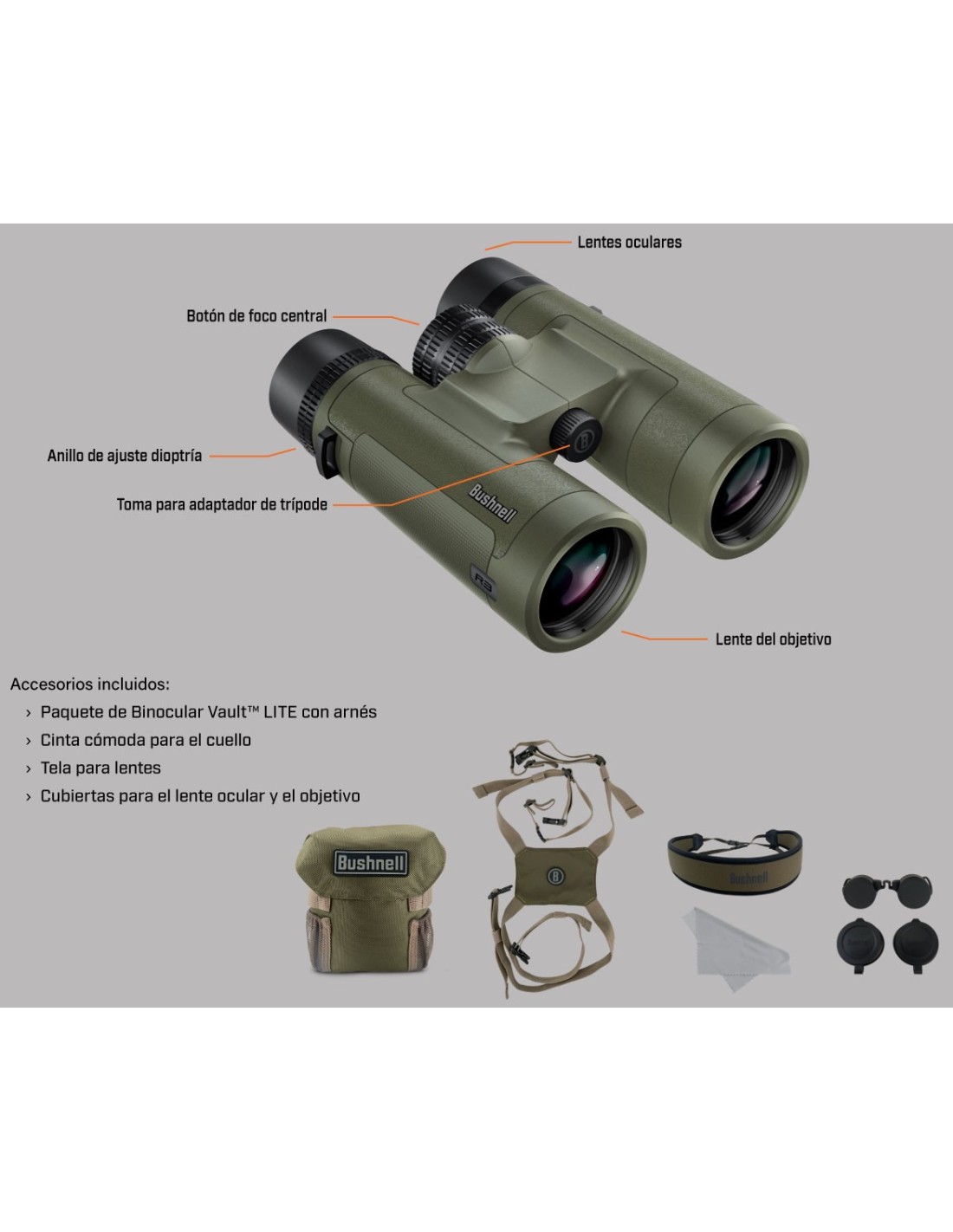 Todos los prismáticos R3 tienen la protección exclusiva EXO Barrier de Bushnell, además de recubrimientos en los prismas que permiten una reflectividad y claridad de la superficie mejoradas. Estos prismáticos vienen con el Arnés Binocular Vault™ LITE, una cómoda y confortable correa para el cuello, cubiertas para lentes, y paño de limpieza.