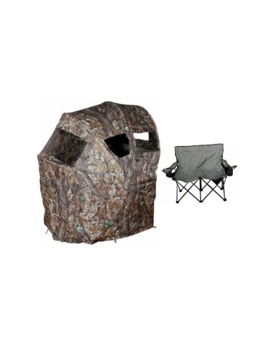 Puesto de camuflaje plegable con silla integrada y estructura con flejes. Fácil de montar y transportar. Disponible para una o dos personas.