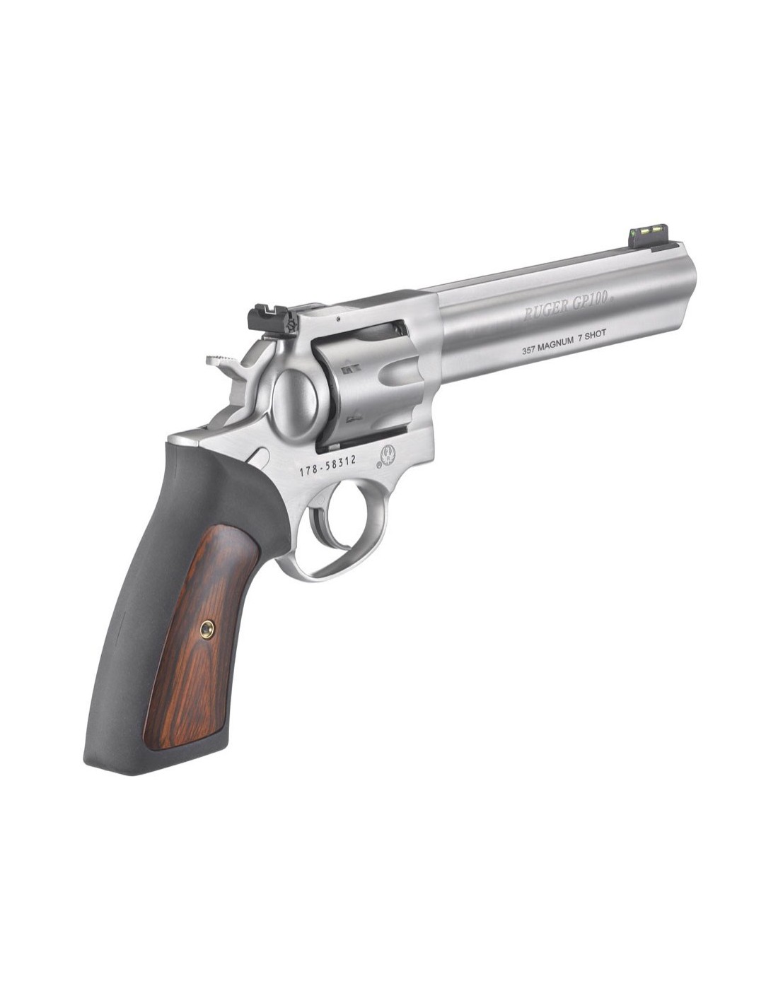 Esta referencia del modelo GP100 cuenta con una empuñadura de caucho acolchada con paneles de madera insertados que ofrece una excelente ergonomía, reduciendo el retroceso y proporcionando una sujeción firme. Además, el GP100 permite la personalización de la empuñadura con paneles de empuñadura intercambiables, lo que permite a los tiradores adaptar el revólver al tamaño de su mano y sus preferencias. Viene equipado con punto de mira de fibra óptica y alza trasera totalmente ajustable en altura y deriva.