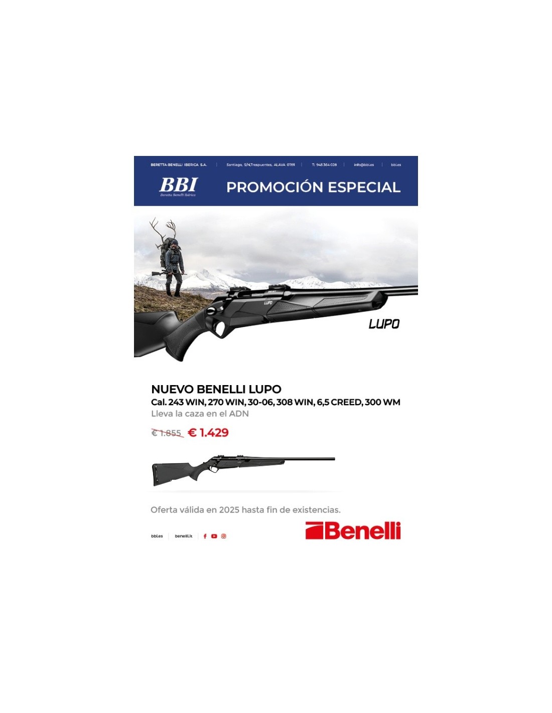 Las características del lobo, el depredador por excelencia, cobran forma en Lupo. Diseñado con un conjunto de soluciones integradas, Lupo garantiza constante precisión sub-M.O.A. La carcasa rígida de aluminio con estructura de chasis garantiza la absoluta rigidez de toda el arma, determinando la excelente precisión. La combinación mecánica perfecta entre caja de obturación de acero rígido tratado térmicamente y obturador fluted con tratamiento BE.S.T., asegura la máxima precisión y hace que el ciclo de armamento sea fluido y rápido, dando al cazador una sensación de absoluta fluidez. No es una simple cantonera especial, sino un verdadero sistema de reducción del retroceso, que concede máxima estabilidad y una segunda adquisición del objetivo más rápida.. El tratamiento criogénico, aplicado al cañón flotante,exalta aún más la precisión del disparo. Con un diseño extremadamente ergonómico, Lupo es el único bolt action en el mundo que garantiza absoluta modularidad y que se adapta al cuerpo de cualquier cazador.