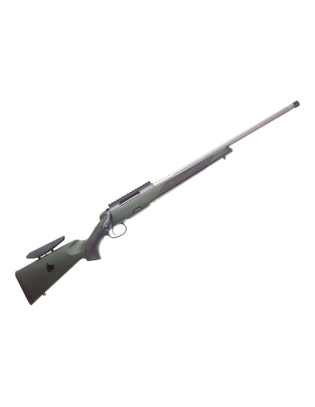 El STEYR Pro Varmint monta culata SX semi Weight de polímero verde, reforzado con vidrio, material resistente a la intemperie y excepcionalmente duradero. La culata es regulable en altura a través del soporte modular integrado en la misma. Viene con una longitud de cañón de 22" (558mm) con paso de estría de 1:10 con rosca y cubre rosca con paso de hilo 5/8x24UNEF. Incorpora un carril Picatinny. El Pro Varmint mide 42.9" (1090mm.) y pesa 3,9 Kg. en vacío. Viene de serie con la bola del cerrojo táctica sobredimensionada para un acerrojamiento rápido y fácil.