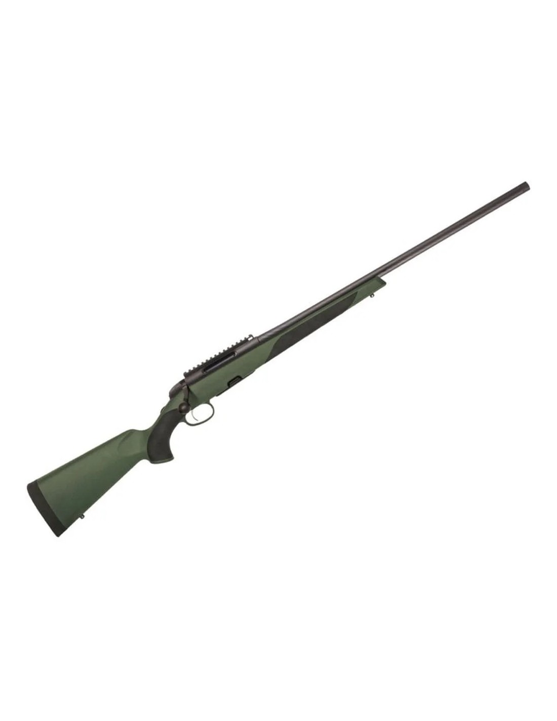 El STEYR THB monta una culata SX semi Weight de polímero verde, reforzado con vidrio, material que es resistente a la intemperie y excepcionalmente duradero. Viene con una longitud de cañón de 25" con paso de estría de 1:8 para maximizar el potencial de las cargas del 6.5 Creedmoor. El cañón vienen roscado para aceptar frenos o supresores con un paso de rosca de 5/8-24 UNEF (se incluye un protector de rosca). Incorpora un carril Picatinny 20MOA. El THB mide 46" (1170mm.) y pesa 4,2 Kg. en vacío. Viene de serie con la bola del cerrojo táctico redondo.