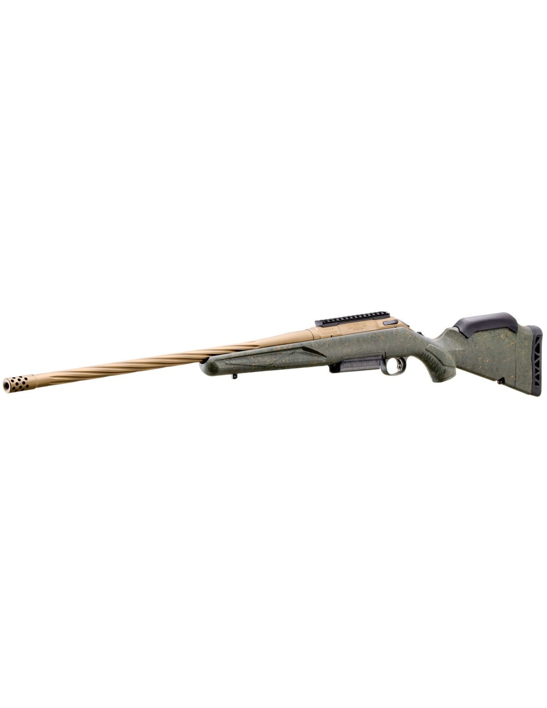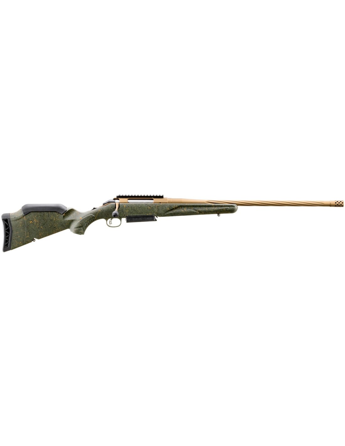 Los modelos estándar de Generación II Predator cuentan con una acción y cañón en acabado Cerakote™ bronce quemado duradero y una culata sintética en color verde oscuro texturizada con salpicaduras negras y grises para un excelente agarre y control del arma. El cañón de 22"" (558mm.) de contorno medio, forjado y martilleado en frío, presenta profundas estrías en espiral, lo que mejora el equilibrio del rifle sin sacrificar la rigidez o la precisión. Viene con un freno de boca radial instalado de fábrica.