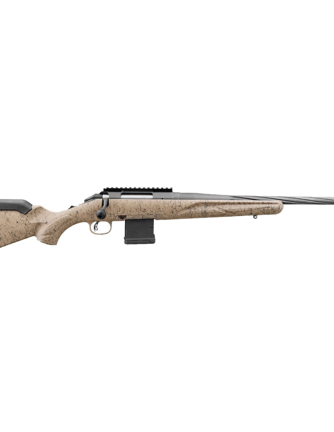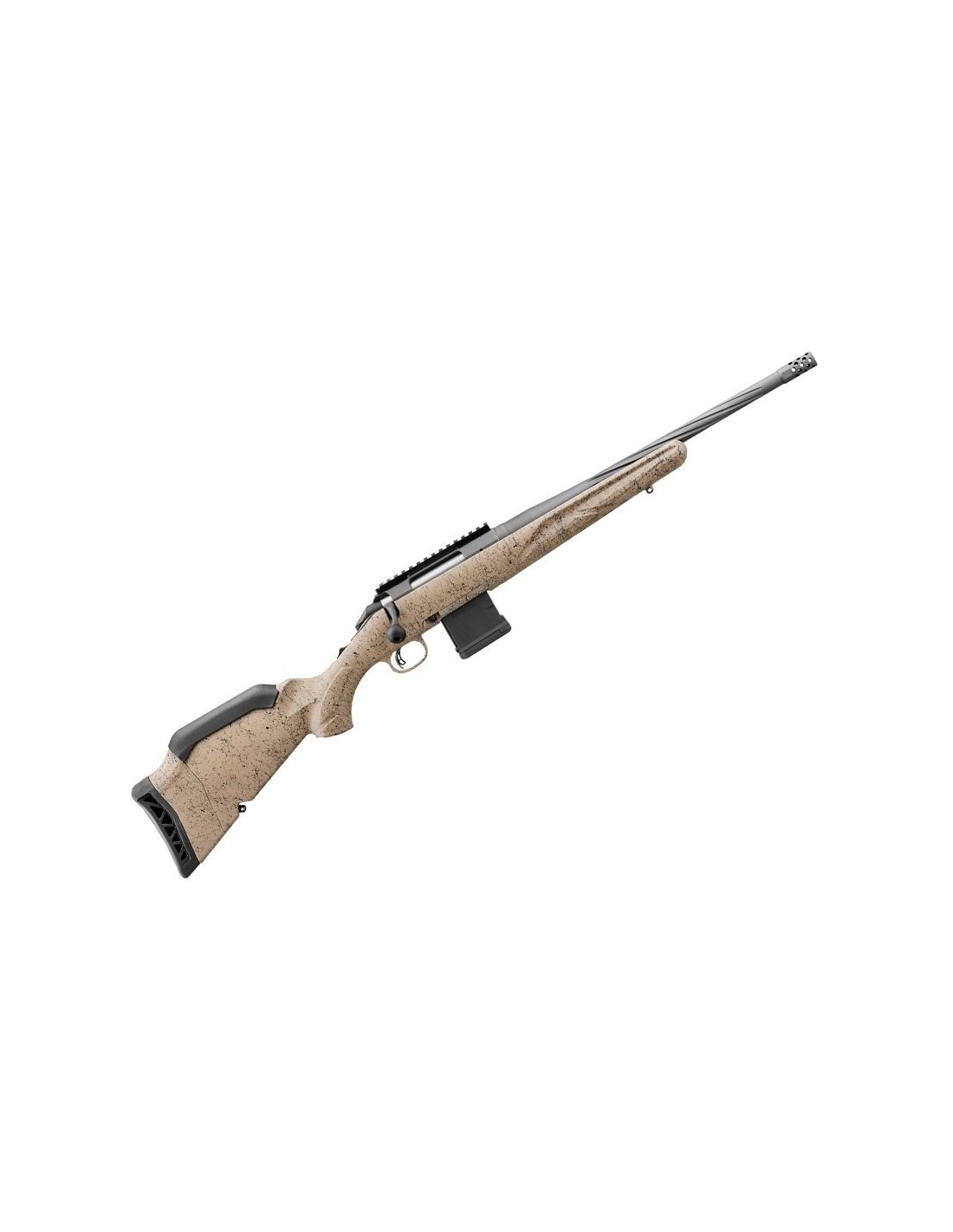 Los modelos Ranch de Generación II cuentan con acción y cañón en acabado Cerakote™ cobalto duradero y una culata sintética en color tierra texturizada con salpicaduras negras y grises para un excelente agarre y control del arma. El cañón compacto de 16.1"" (408mm.) de contorno medio, forjado y martilleado en frío, presenta profundas estrías en espiral, lo que mejora el equilibrio del rifle sin sacrificar la rigidez o la precisión. Viene con un freno de boca radial instalado de fábrica.