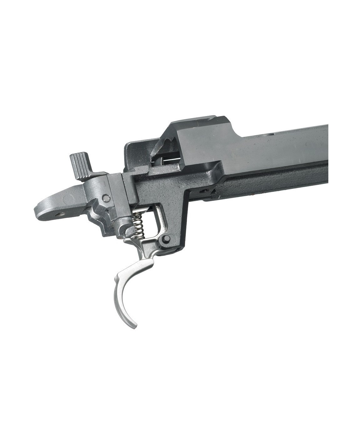 - Seguro de tres posiciones de fácil acceso y que permite al tirador bloquear el cerrojo o cargar y descargar el rifle con el seguro puesto.