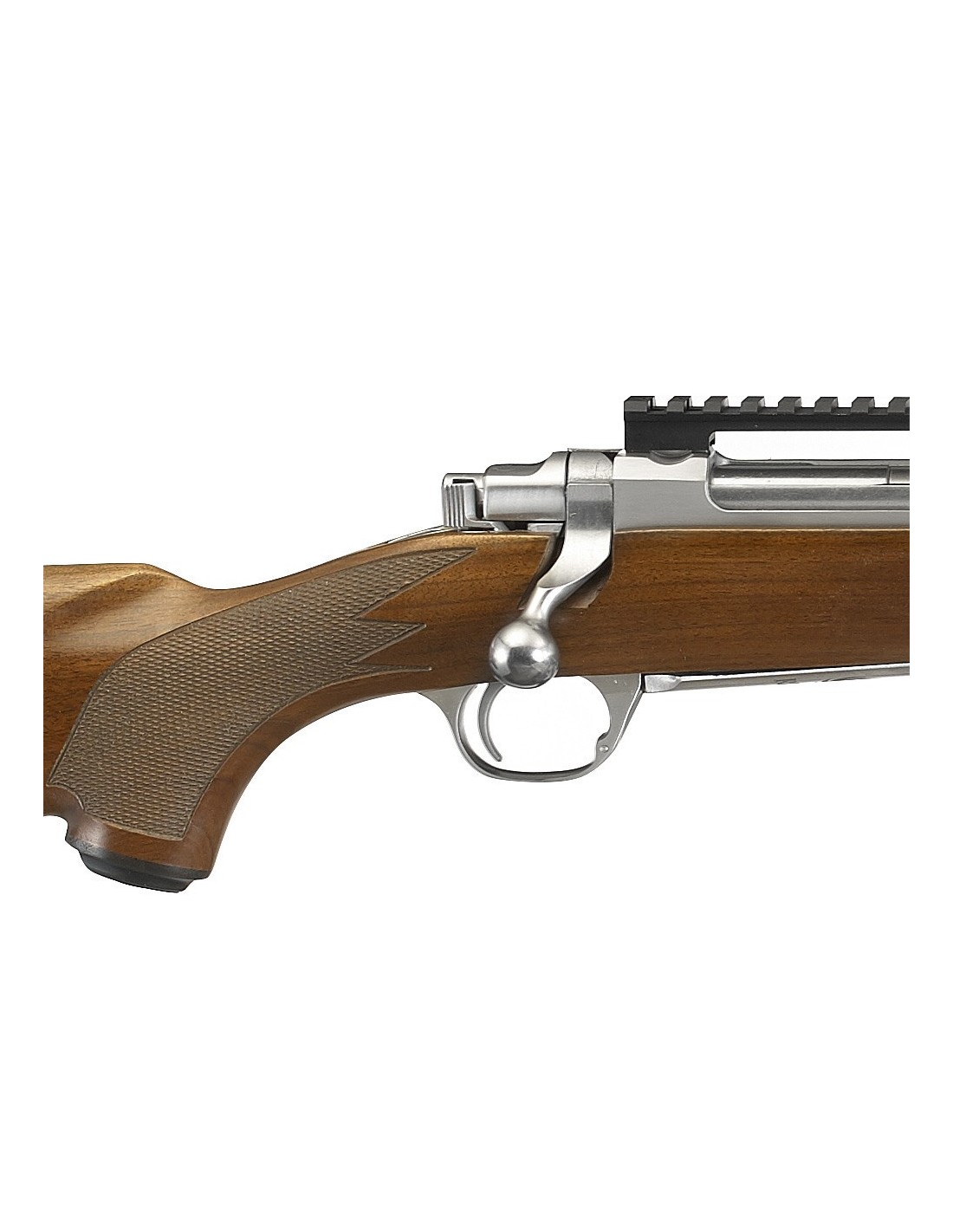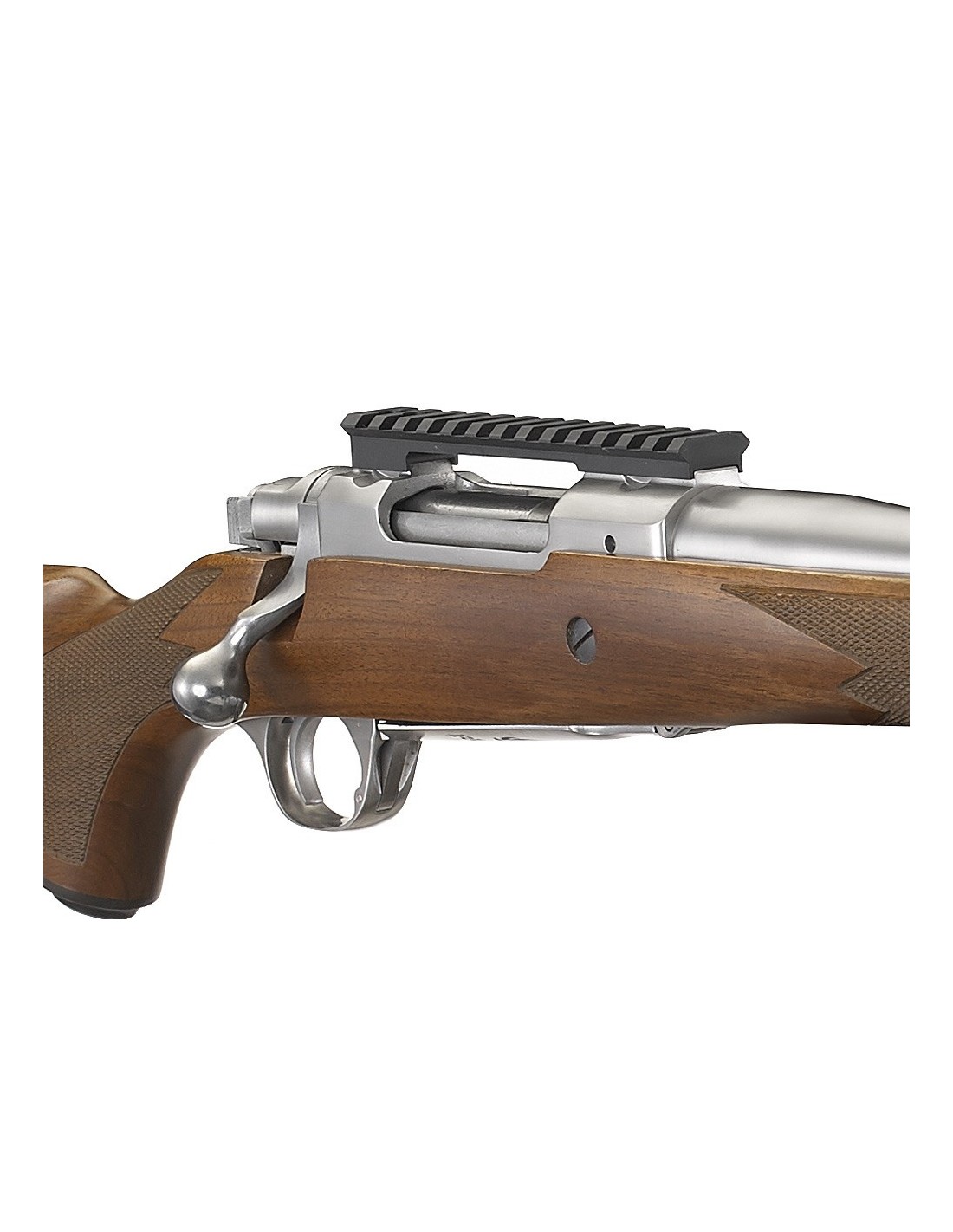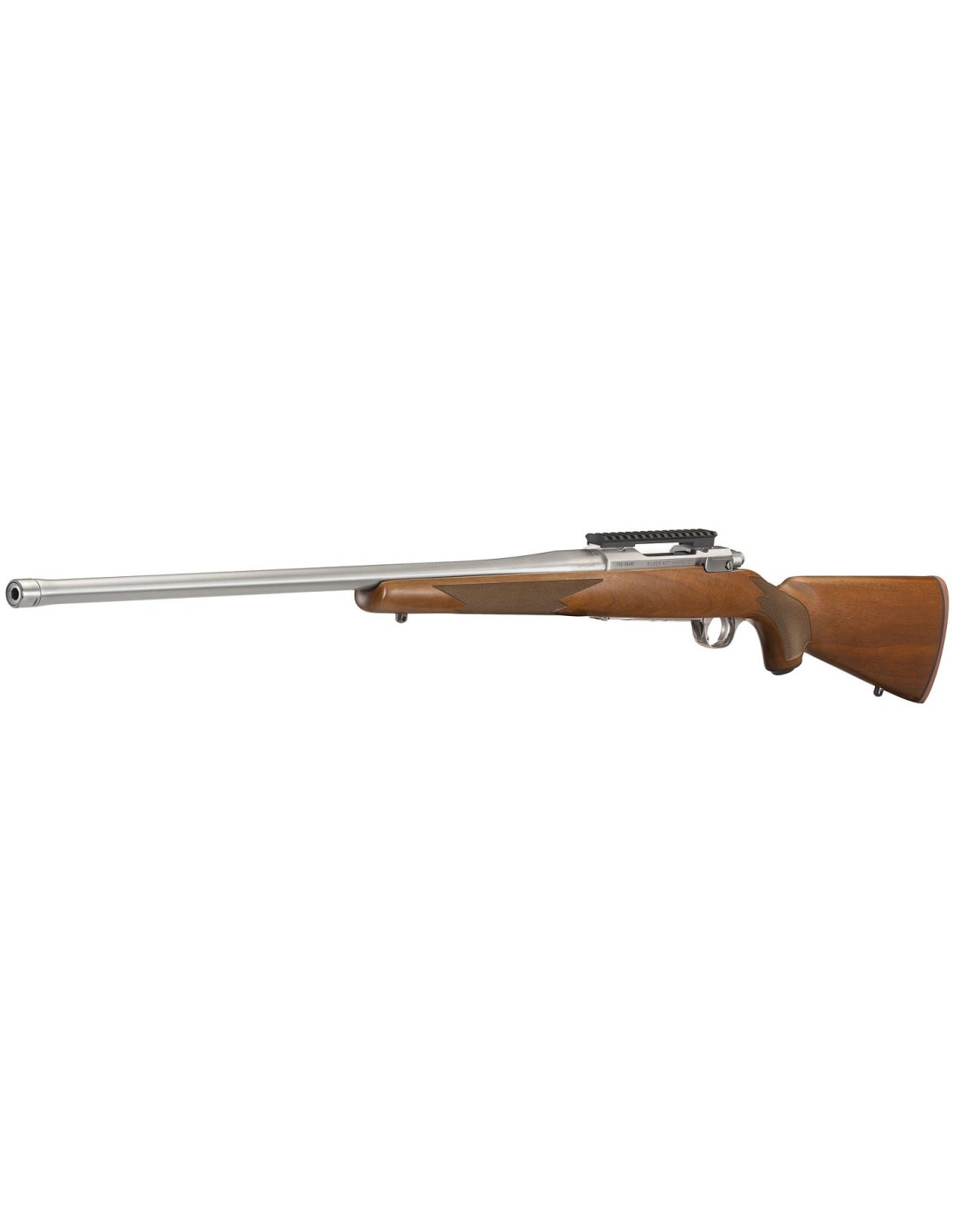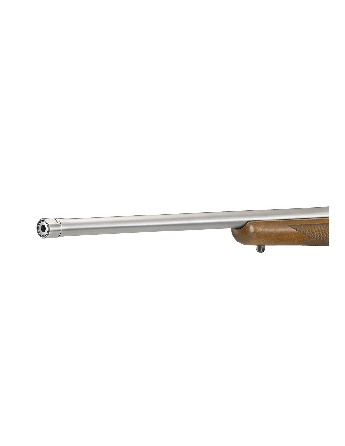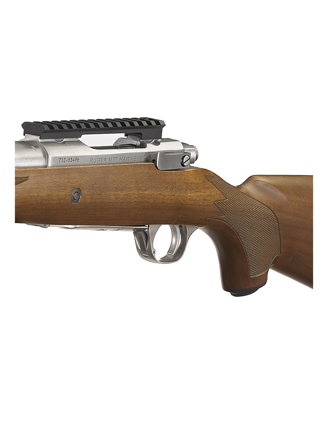 - Carril Picatinny de 20 MOA asegurado con cuatro tornillos 8-40, instalado de serie en el sistema integrado de montaje para monturas patentado por Ruger, mecanizado directamente en la acción de acero inoxidable.