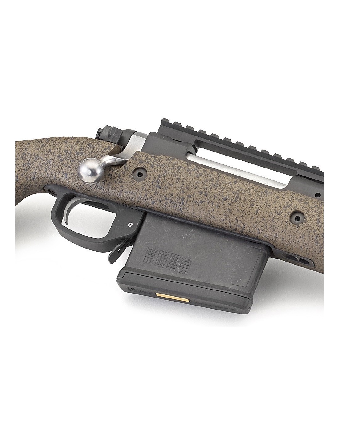 - Seguro de tres posiciones de fácil acceso y que permite al tirador bloquear el cerrojo o cargar y descargar el rifle con el seguro puesto.